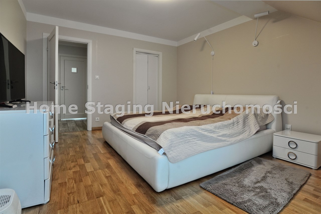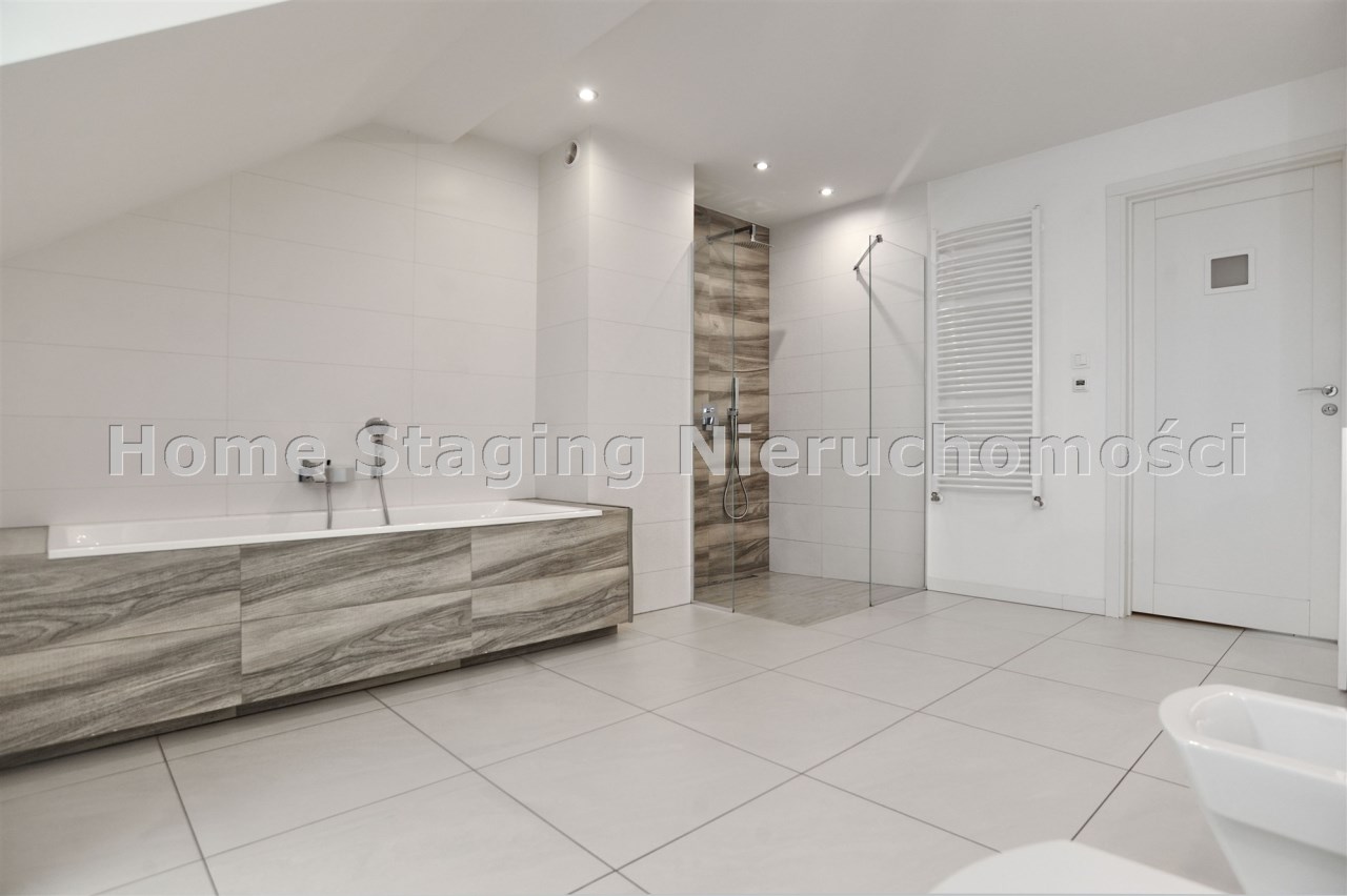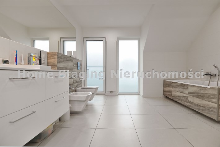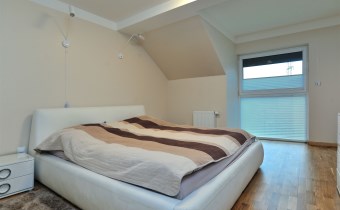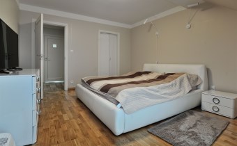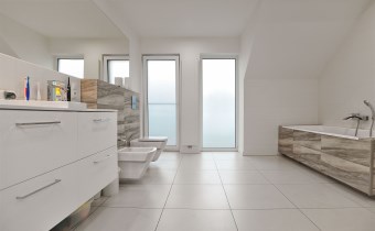 Piętro: trzy komfortowe sypialnie (jedna z garderobą), elegancka łazienka z wanną, prysznicem, bidetem i podwójną umywalką, wyjście na balkon z łazienki i sypialni.