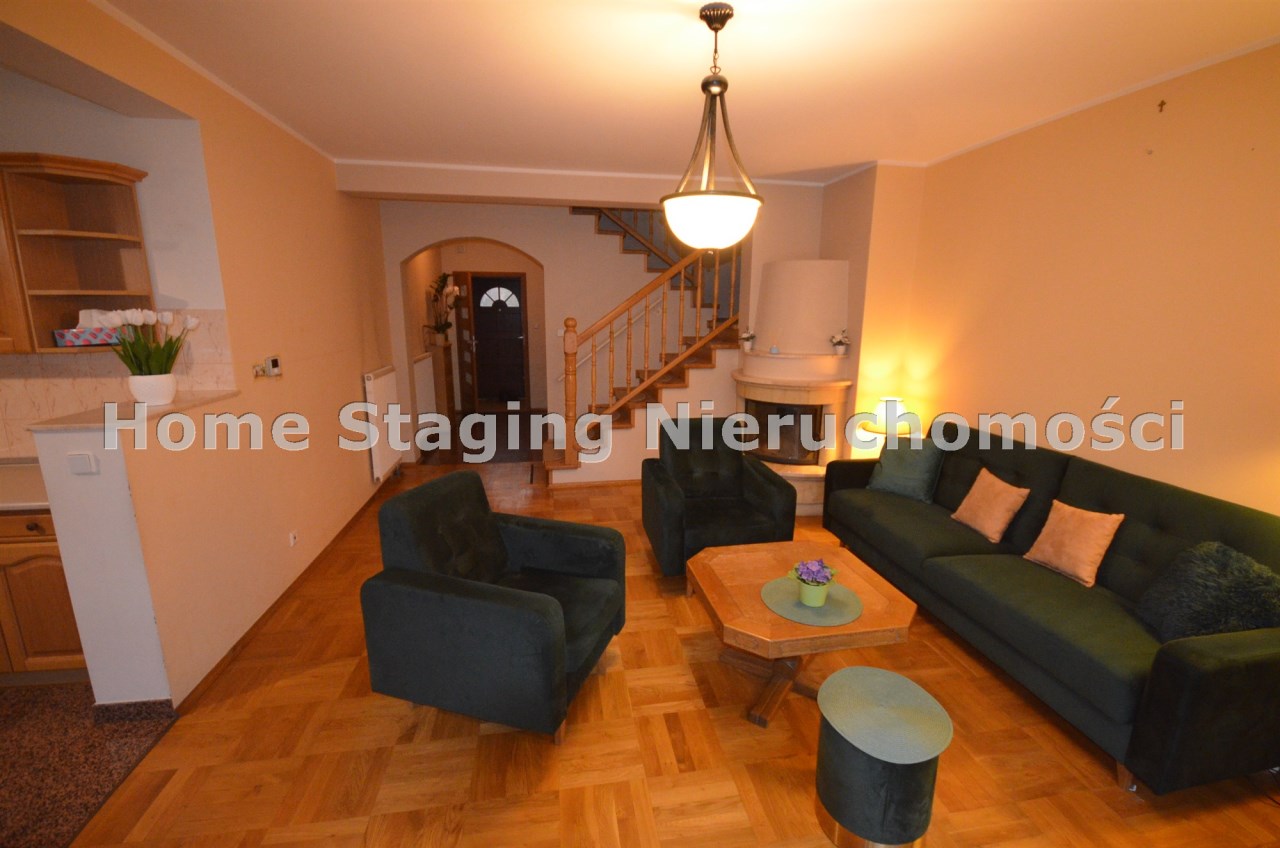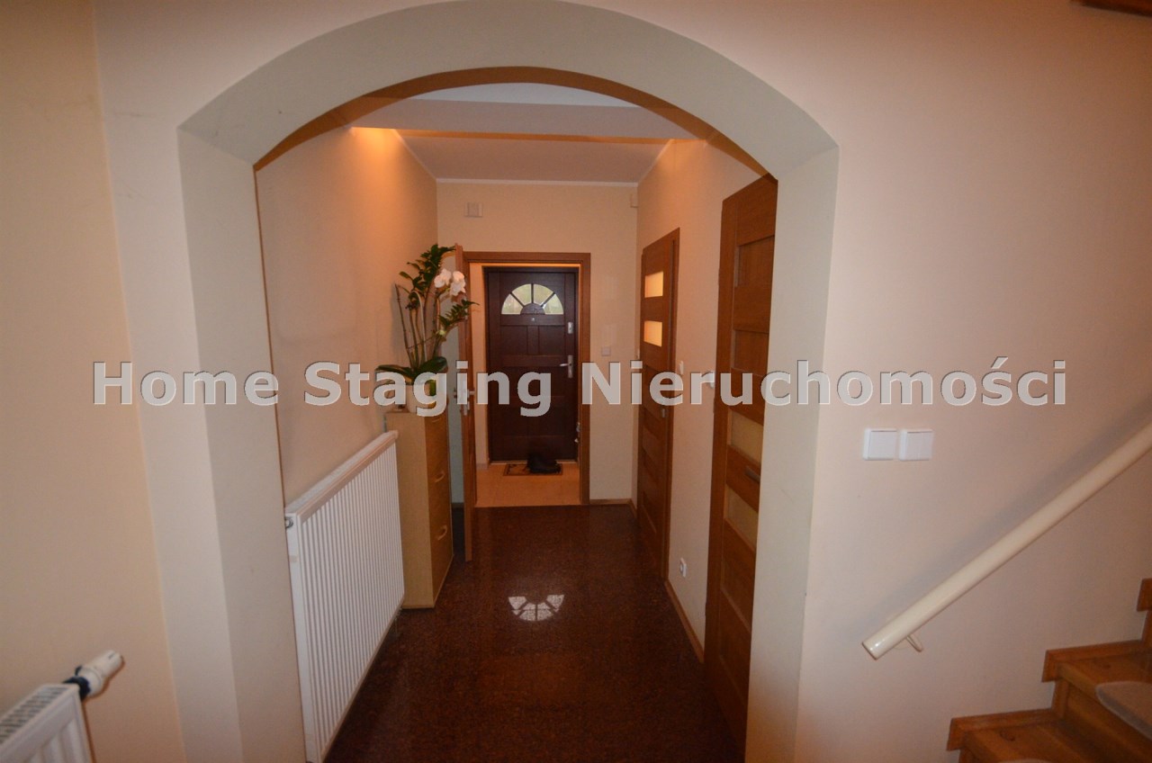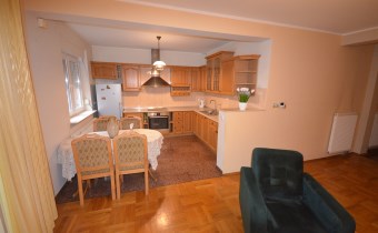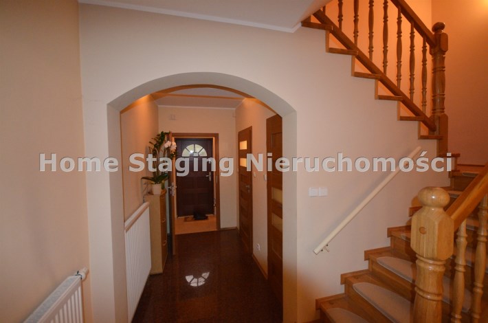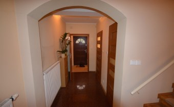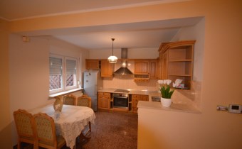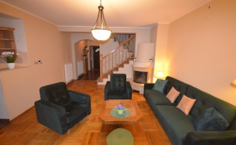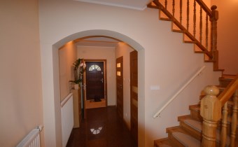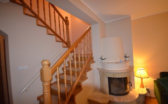 Na pierwszym piętrze znajdują się 3 pokoje, łazienka z wc i wanną. Na poddasze prowadzą również drewniane schody i jest tam zagospodarowany pokój, łazienka z wc oraz duży otwarty pokój z widokiem na ogród. Nieruchomość w pełni umeblowana w standardzie powyżej średniej, po remoncie 3 lata temu . Brama wjazdowa automatycznie zamykana na pilota.