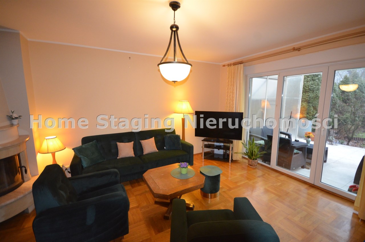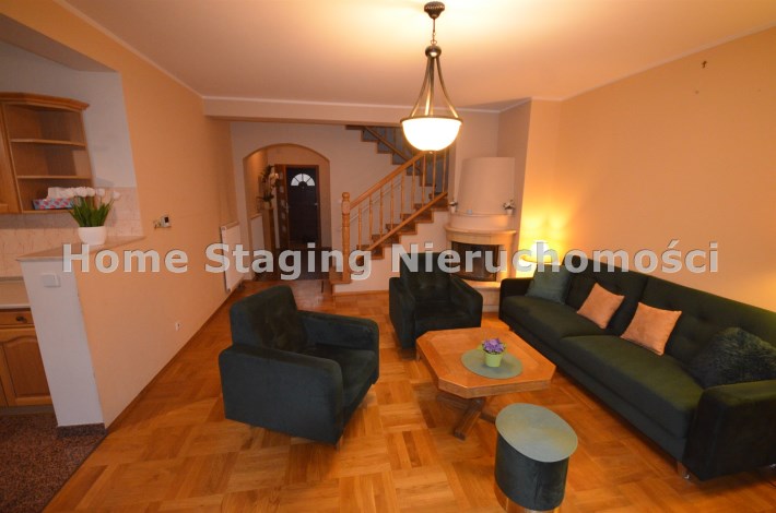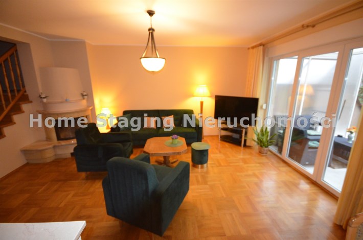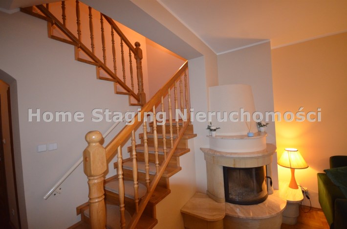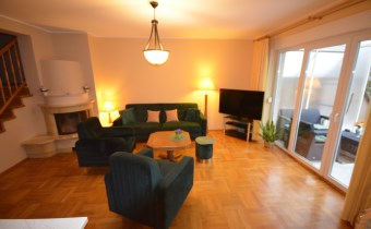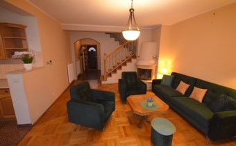 Na parterze salon z kominkiem i wyjściem na taras i do zagospodarowanego ogrodka ,otwarta kuchnia - umeblowana -wyposażona w agd, oraz łazienka z wc, przejście do długiego garażu zamykanego automatycznie na pilota.