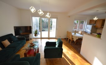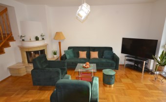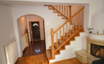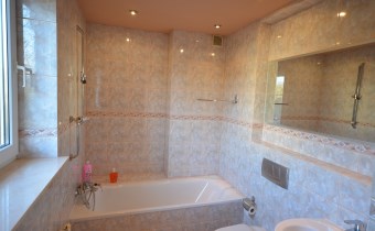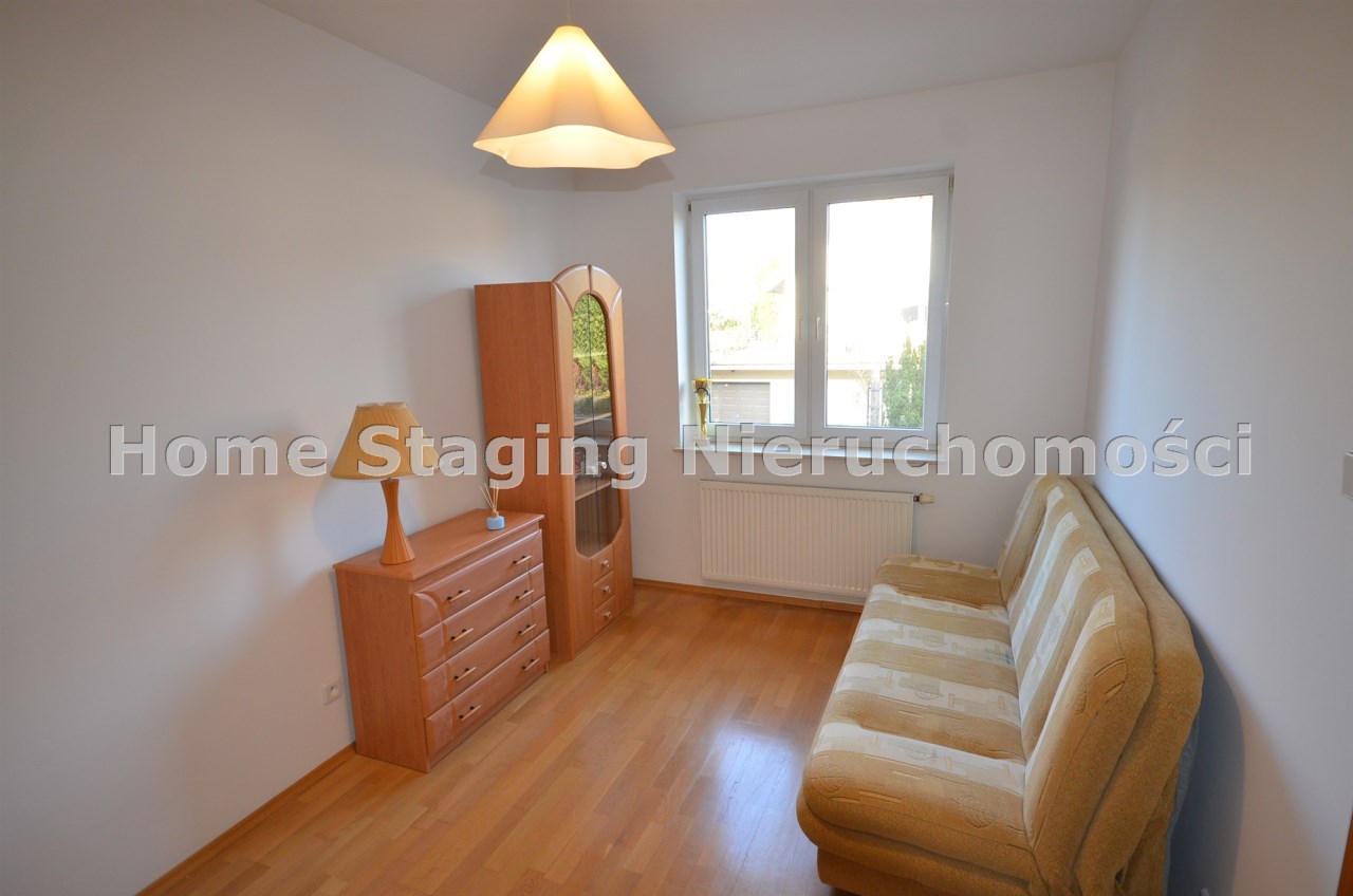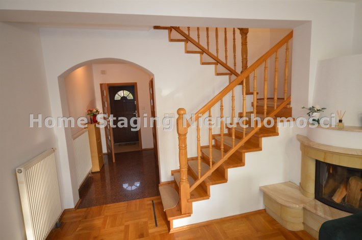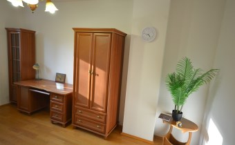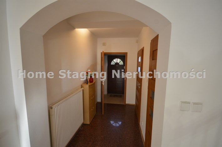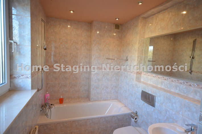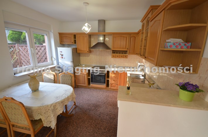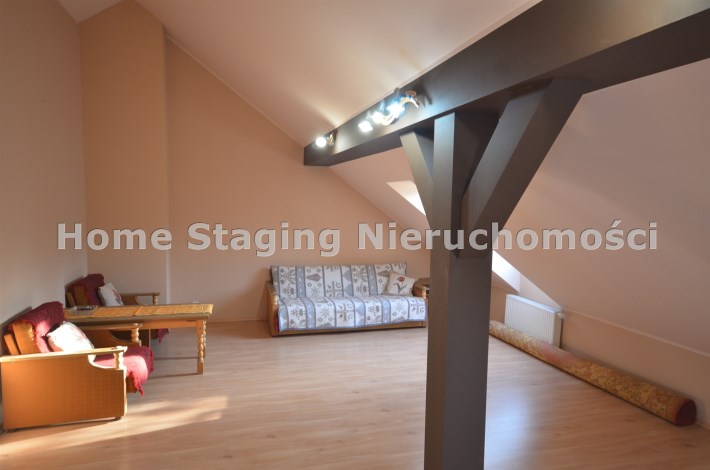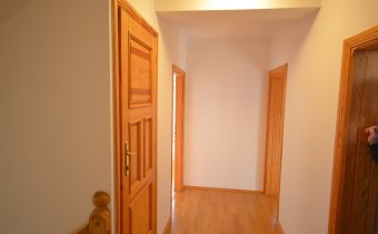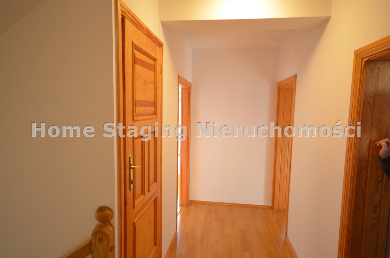 Na pierwszym piętrze znajdują się 3 pokoje, łazienka z wc i wanną. Na poddasze prowadzą również drewniane schody i jest tam zagospodarowany pokój, łazienka z wc oraz duży otwarty pokój z widokiem na ogród. Nieruchomość w pełni umeblowana w standardzie powyżej średniej, po remoncie 3 lata temu . Brama wjazdowa automatycznie zamykana na pilota.