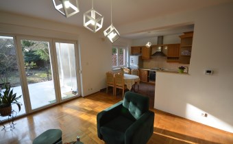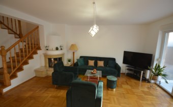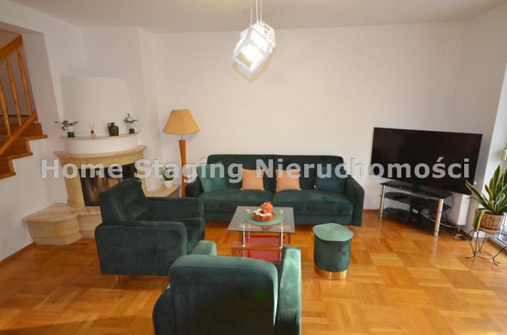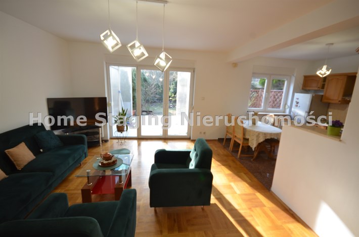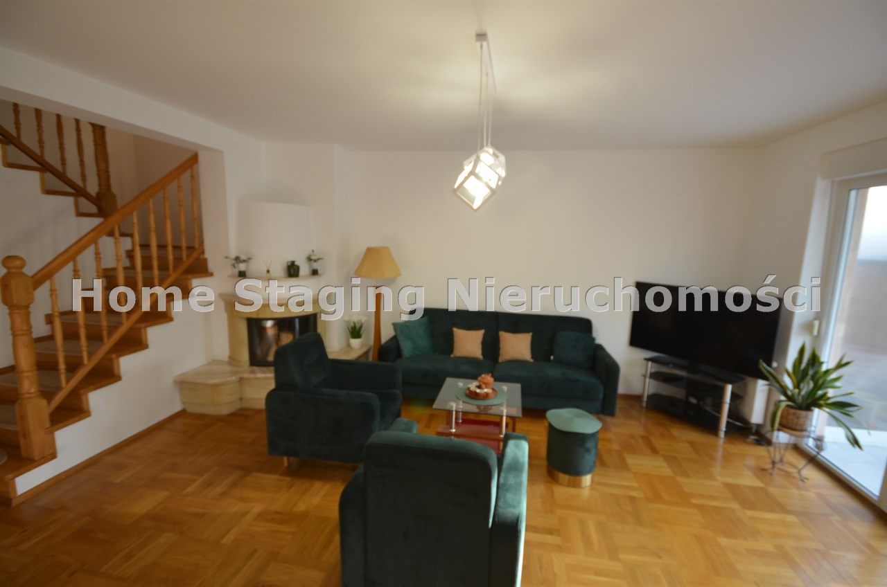 Na parterze salon z kominkiem i wyjściem na taras i do zagospodarowanego ogrodka ,otwarta kuchnia - umeblowana meblami dębowymi -wyposażona w agd, oraz łazienka z wc, przejście do długiego garażu zamykanego automatycznie na pilota.