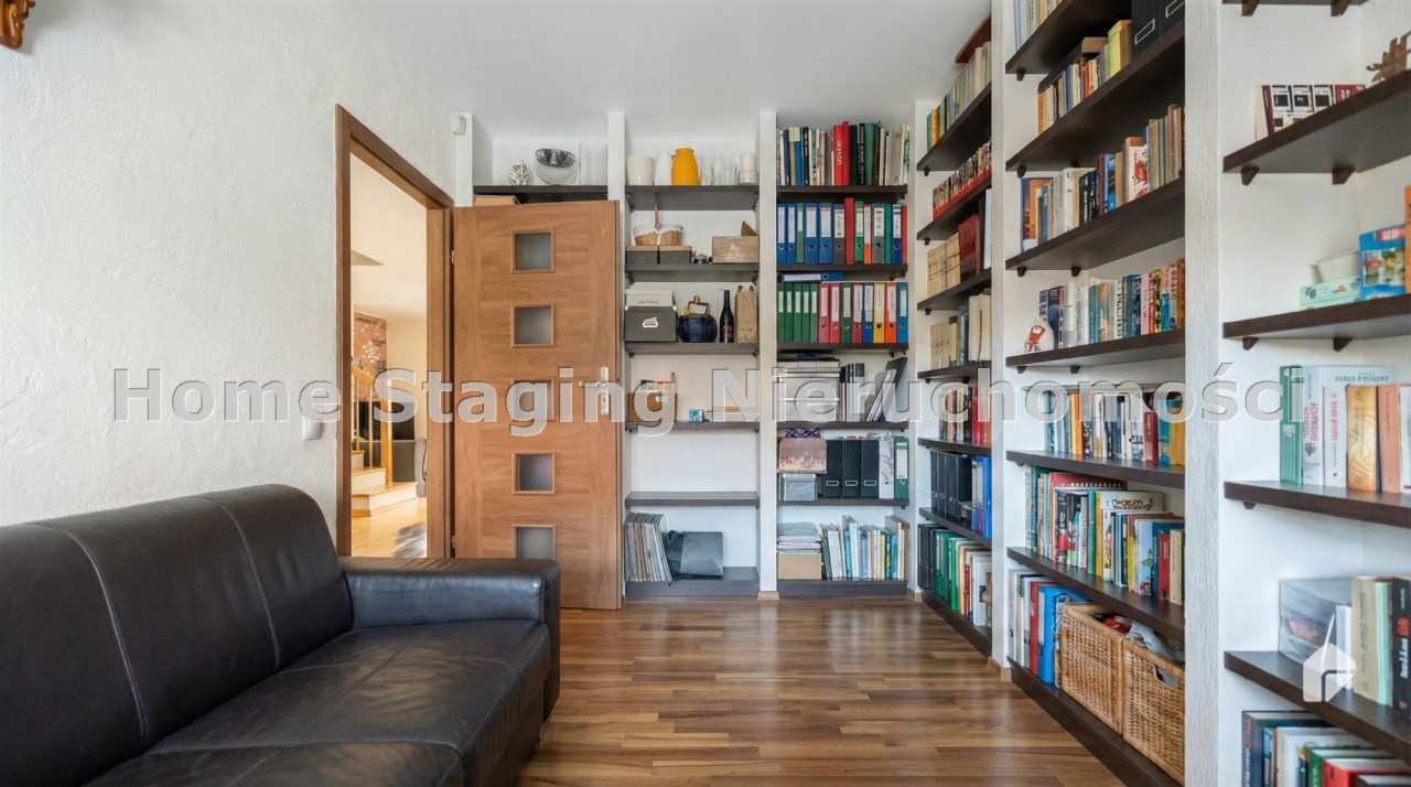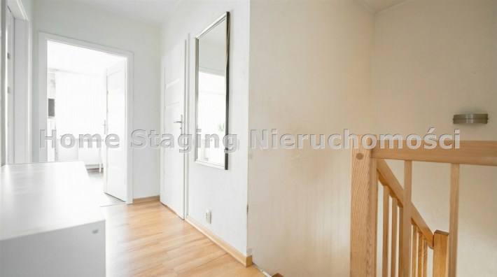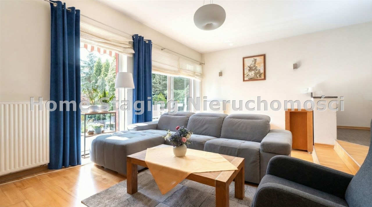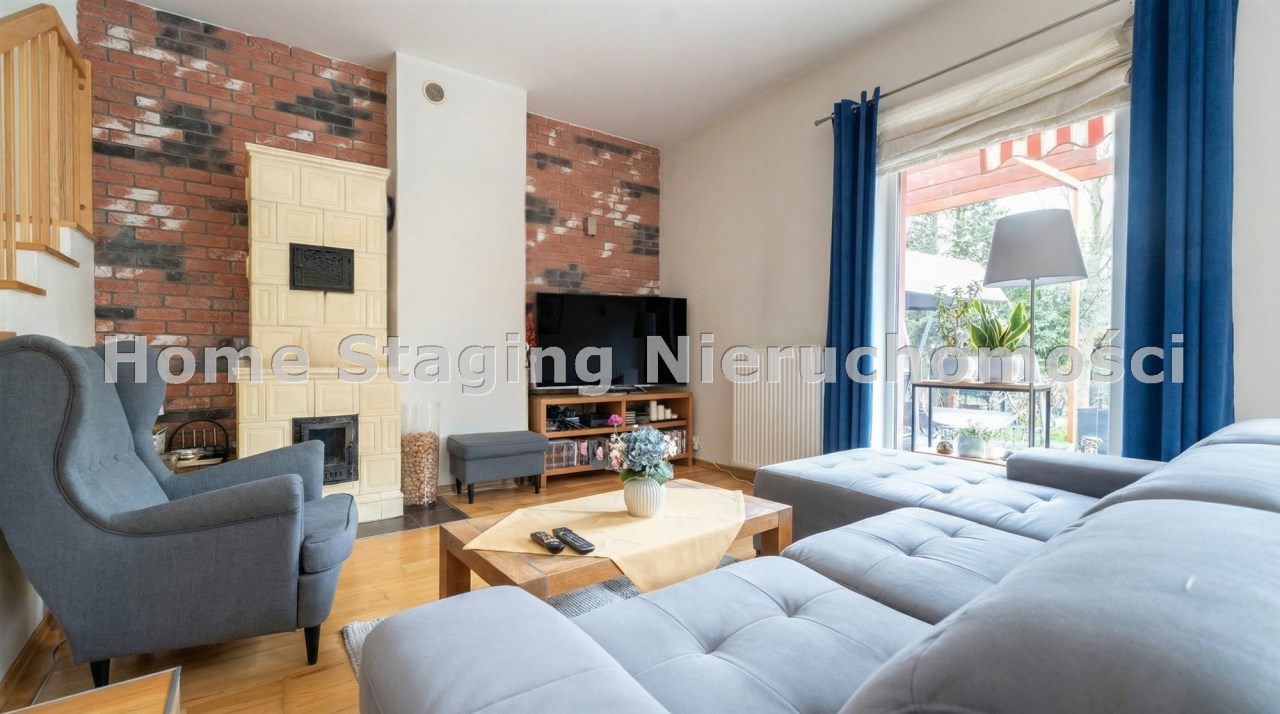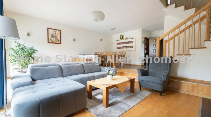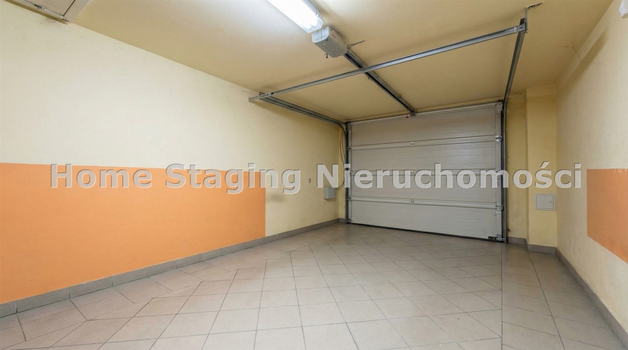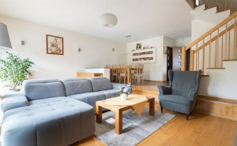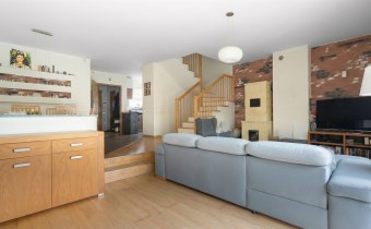 Parter to duży salon z otwartą kuchnia, podzielony na dwie strefy. Strefę kuchenno -jadalnianą i wypoczynkową. Kuchnia z oknem w jasnej zabudowie , w jadalni duży stół z krzesłami. Strefa wypoczynkowa z panoramicznymi przesuwnymi oknami skąd jest wyjście na duży taras i słoneczny ogród. W salonie właściciele , zamiast kominka wstawili piec kaflowy. Na tym poziomie znajduje się pokój (gabinet ) o powierzchni ponad 12 m kw oraz toaleta. Tu też znajdują się schody prowadzące na piętro pierwsze oraz na poziom -1. Piętro pierwsze to trzy sypialnie, garderoba oraz łazienka z oknem i z dużym prysznicem Dzięki usytuowaniu okien, pokoje są dobrze doświetlone a zarazem bardzo ustawne. W dwóch sypialniach balkony. Nad piętrem jest poddasze służące do przechowywania. Poziom -1 to duży garaż o powierzchni ponad 25 m oraz dwa dodatkowe pomieszczenia spełniające funkcje pralni i piwnicy.
