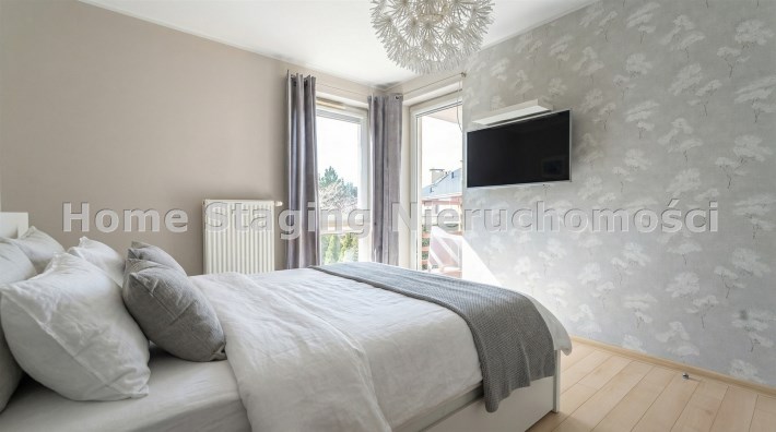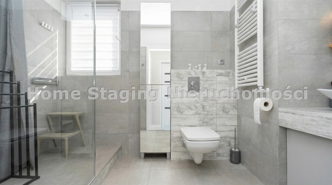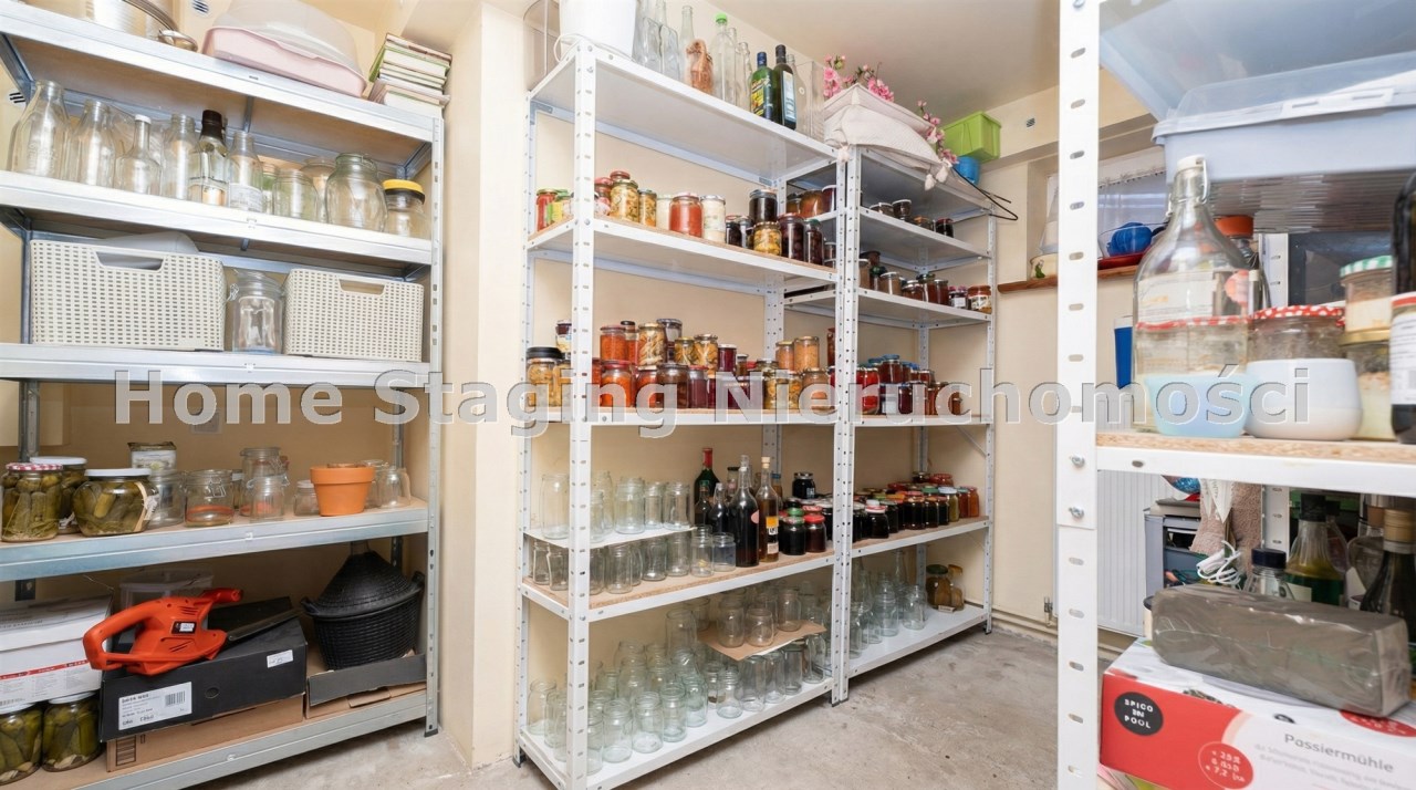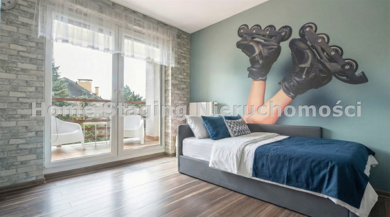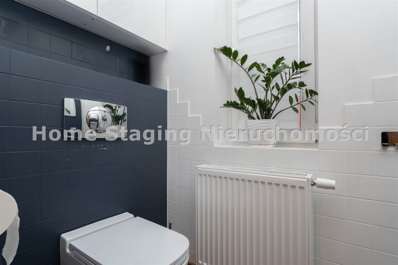 Parter to duży salon z otwartą kuchnia, podzielony na dwie strefy. Strefę kuchenno -jadalnianą i wypoczynkową. Kuchnia z oknem w jasnej zabudowie , w jadalni duży stół z krzesłami. Strefa wypoczynkowa z panoramicznymi przesuwnymi oknami skąd jest wyjście na duży taras i słoneczny ogród. W salonie właściciele , zamiast kominka wstawili piec kaflowy. Na tym poziomie znajduje się pokój (gabinet ) o powierzchni ponad 12 m kw oraz toaleta. Tu też znajdują się schody prowadzące na piętro pierwsze oraz na poziom -1. Piętro pierwsze to trzy sypialnie, garderoba oraz łazienka z oknem i z dużym prysznicem Dzięki usytuowaniu okien, pokoje są dobrze doświetlone a zarazem bardzo ustawne. W dwóch sypialniach balkony. Nad piętrem jest poddasze służące do przechowywania. Poziom -1 to duży garaż o powierzchni ponad 25 m oraz dwa dodatkowe pomieszczenia spełniające funkcje pralni i piwnicy.