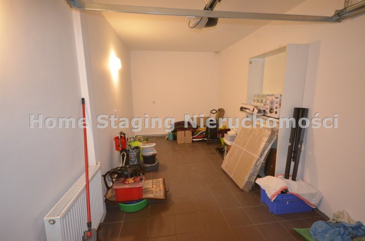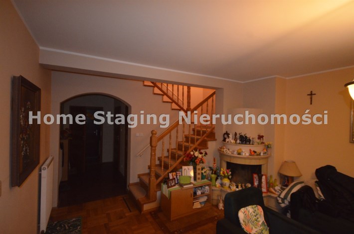 Na parterze salon z kominkiem i wyjściem na taras i do zagospodarowanego ogrodka ,otwarta kuchnia oraz łazienka z wc, przejście do długiego garażu.