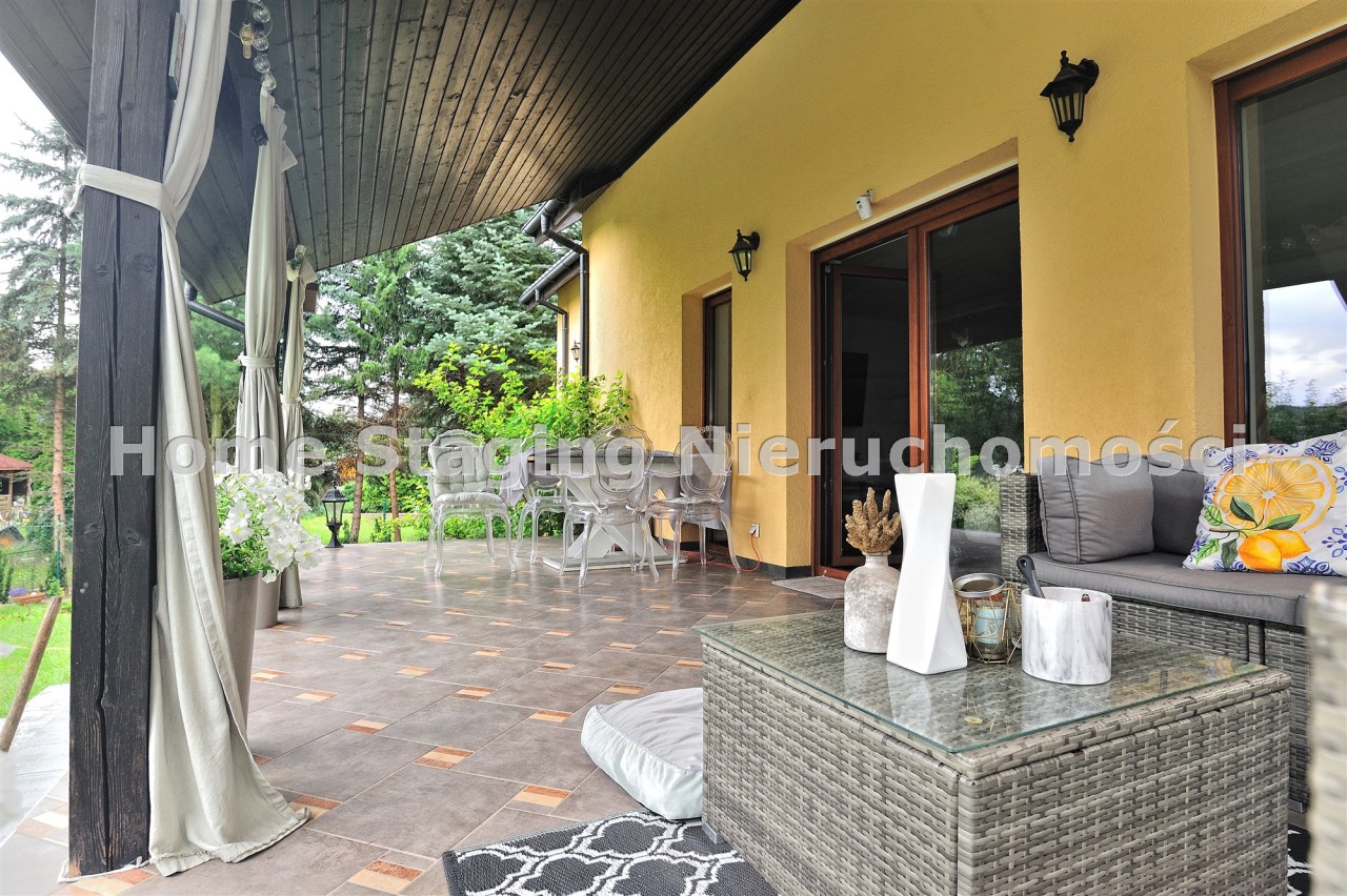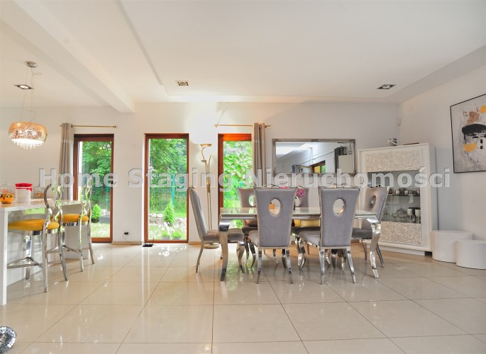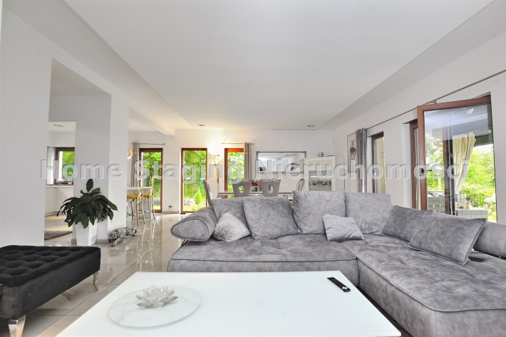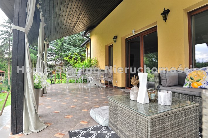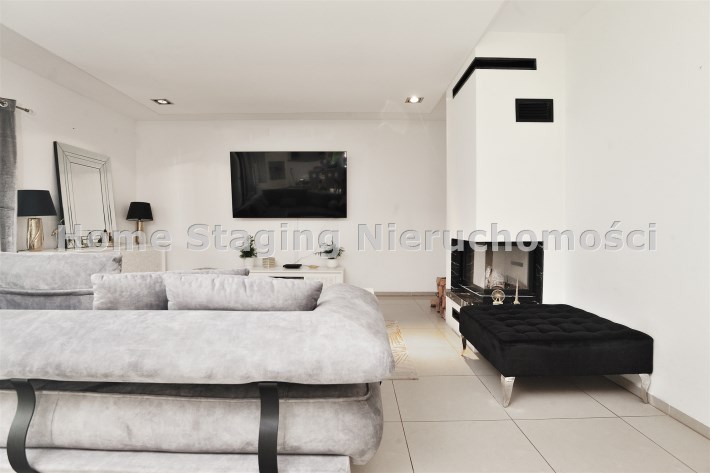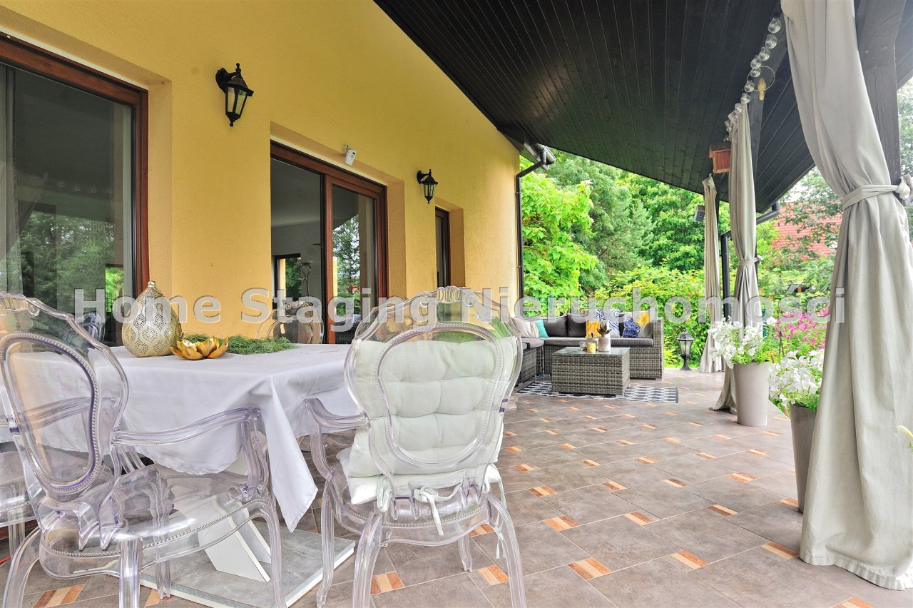Przestronny, jasny salon z wyjściem na zadaszony taras od strony południowej