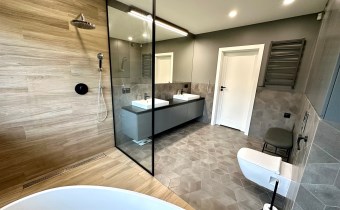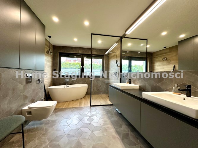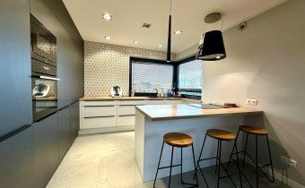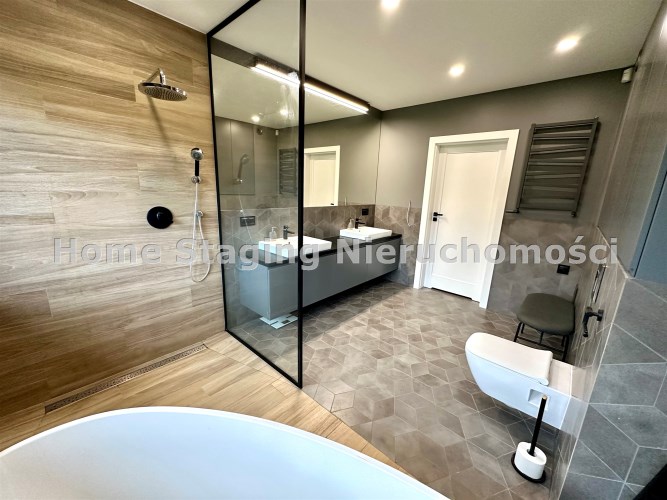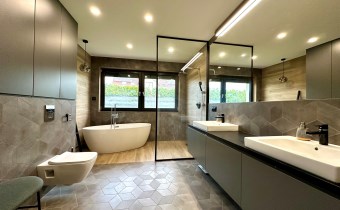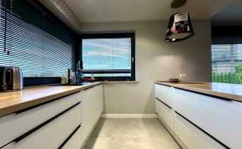 Dom wykończony w podwyższonym standardzie wykończenia. Indywidualne zabudowy na wymiar, baterie podtynkowe, markowej jakości sprzęty oraz armatura. Rozprowadzona instalacja centralnego odkurzacza.
