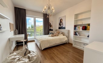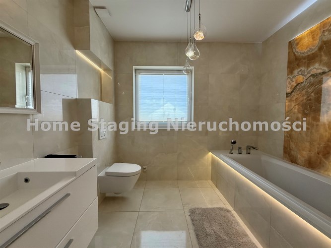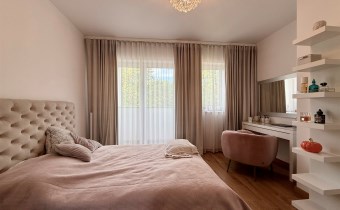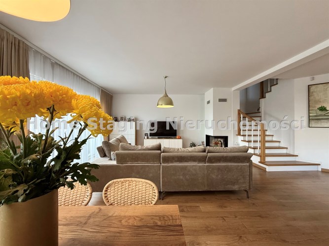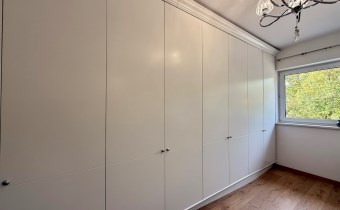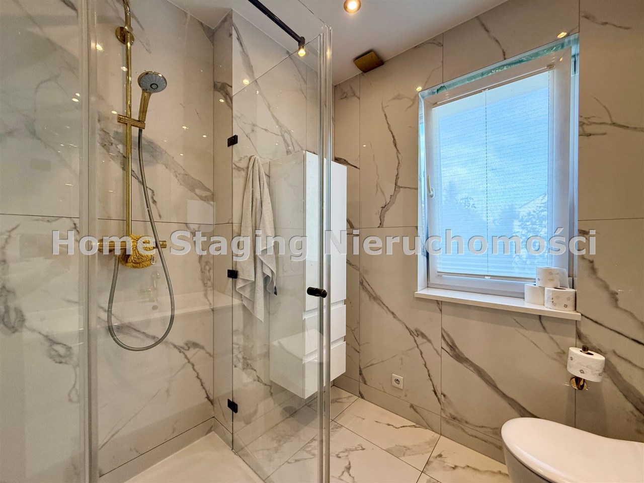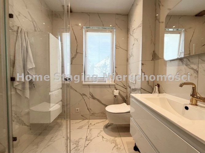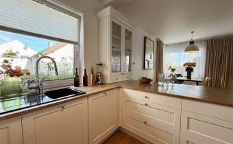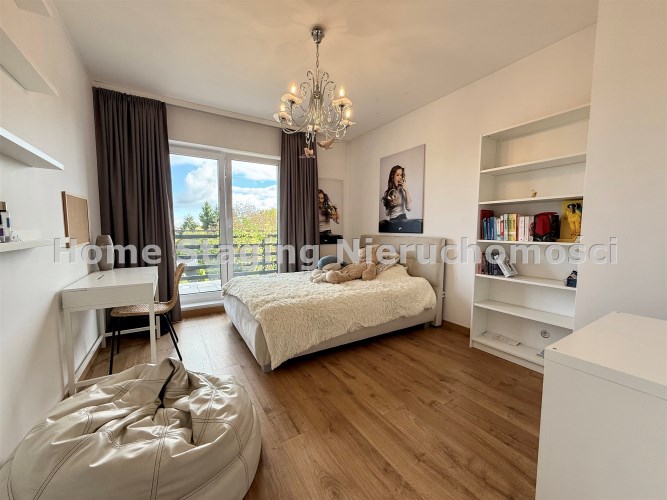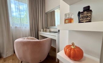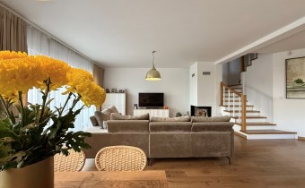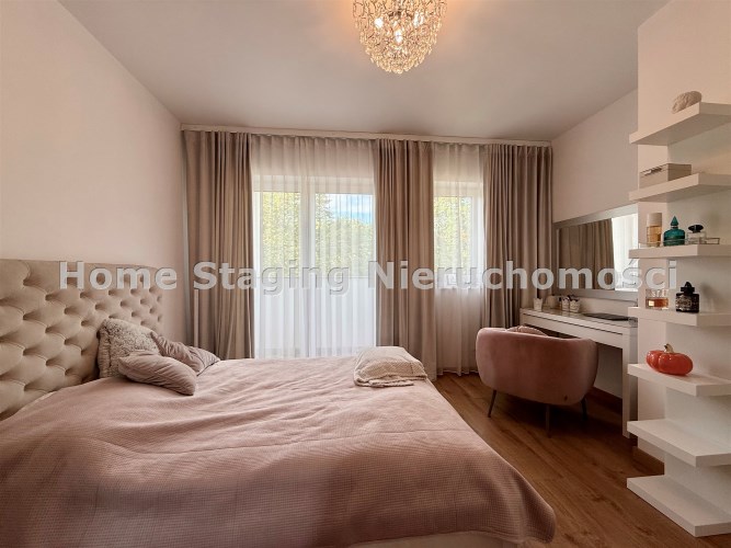 Wnętrze domu obejmuje 5 pokoi, w tym 4 sypialnie z czego jedna została zagospodarowana na garderobę, co zapewnia wygodę nawet dla dużej rodziny. Budynek z garażem w bryle i bezpośrednim wejściem do części mieszkalnej.