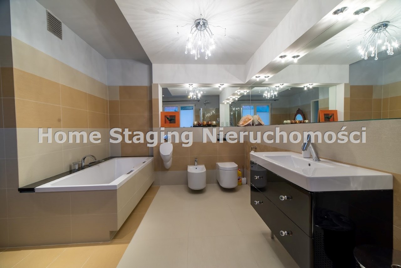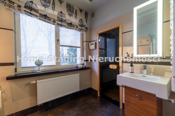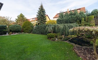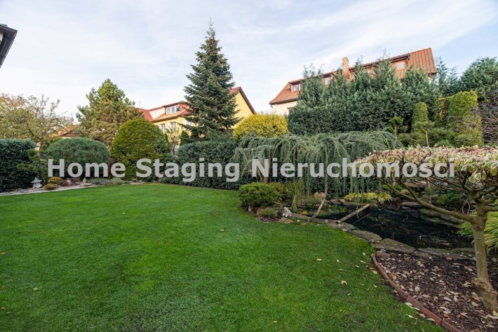 Nieruchomość usytuowana jest frontem do parku, na przepięknie zagospodarowanej działce o powierzchni 716 m² z oczkiem wodnym zarybionym, licznymi nasadzeniami i idealnie utrzymanym trawnikiem wyposażonym w automatyczny system nawadniania i robota koszącego.