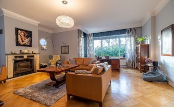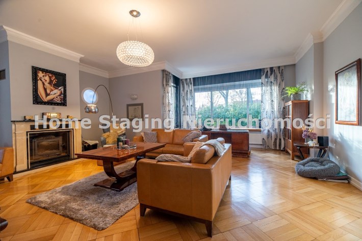 • Przestronny salon z kominkiem i oryginalnymi, poniemieckimi, rozsuwanymi drzwiami prowadzącymi do jadalni,