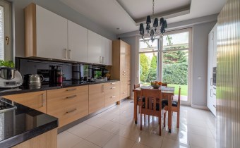 Z kuchni i jadalni można wyjść bezpośrednio na taras z widokiem na ogród — idealne miejsce na poranną kawę lub spotkania z bliskimi.