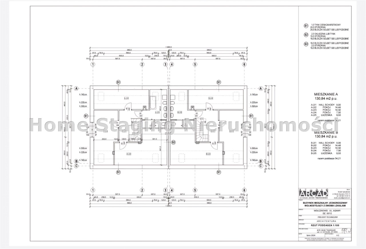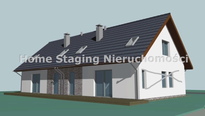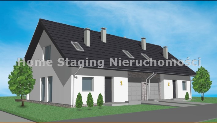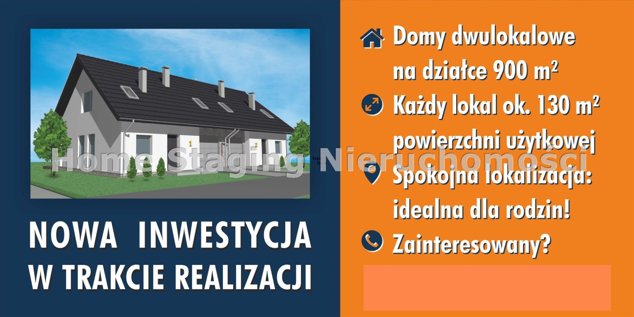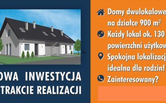 Dom jednorodzinny dwulokalowy na na działce 900 m2 , dla każdej połowy po 450 m2, każda połówka domu to ok.130m2 powierzchni użytkowej. W projekcie podwójna ściana z dylatacją między sąsiadami co jest wymagane w zabudowie bliźniaczej a czego nikt z deweloperów nie stosuje w przypadku budynków dwulokalowych. Dostępne media: prąd, woda z wodociągu miejskiego ( w trakcie budowy), gaz lub pompa ciepła, szambo.  Budynki w stanie surowym zamkniętym z elewacją i mediami doprowadzonymi do budynku . Klient na tym etapie ma możliwość zastanowienia się nad rodzajem ogrzewania, jak również decyduje o wszystkim co będzie robił wewnątrz budynku przy jego wykańczaniu.  Budynki do wydania w III kwartale 2025 roku