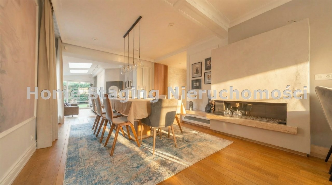 - otwarta jadalnia z dużym stołem i kominkiem