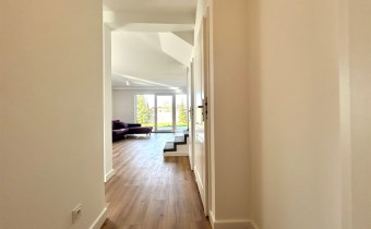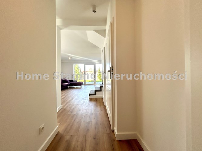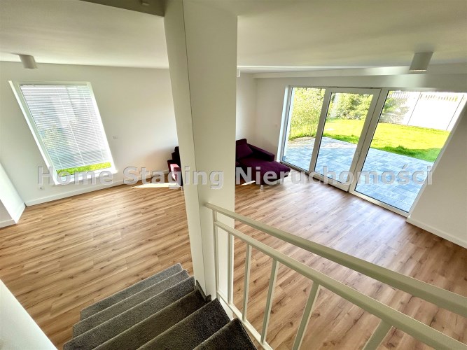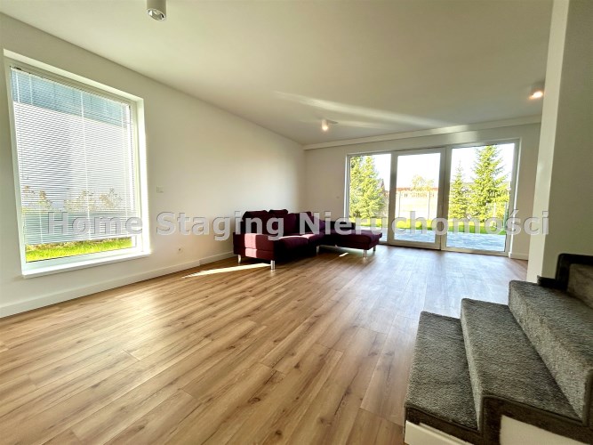 Dom wykończony w jasnych, nowoczesnych barwach, z dużymi przeszkleniami i ogrzewaniem podłogowym w całym budynku.