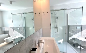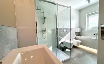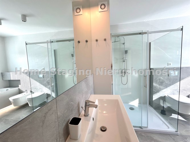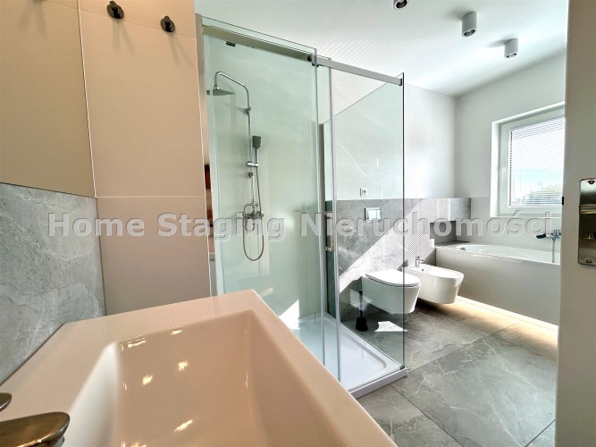 Piętro: trzy sypialnie, garderoba, przestronna łazienka z wanną i prysznicem.