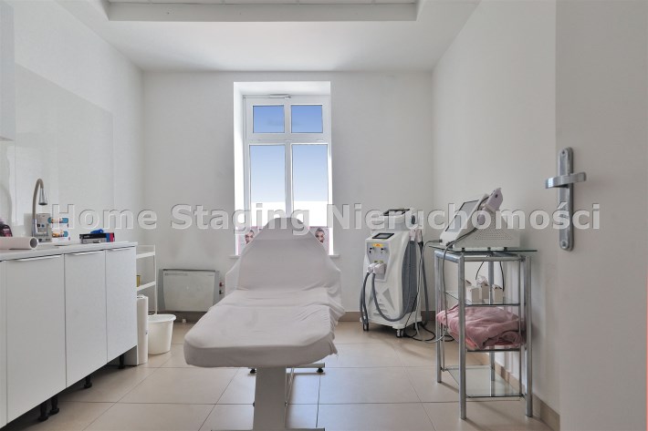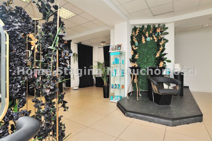 Główna przestrzeń usługowa to ok63m, obecnie mieści się tam gabinet fryzjerski z dwoma stanowiskami, myjką, recepcją i częścią wypoczynkową.