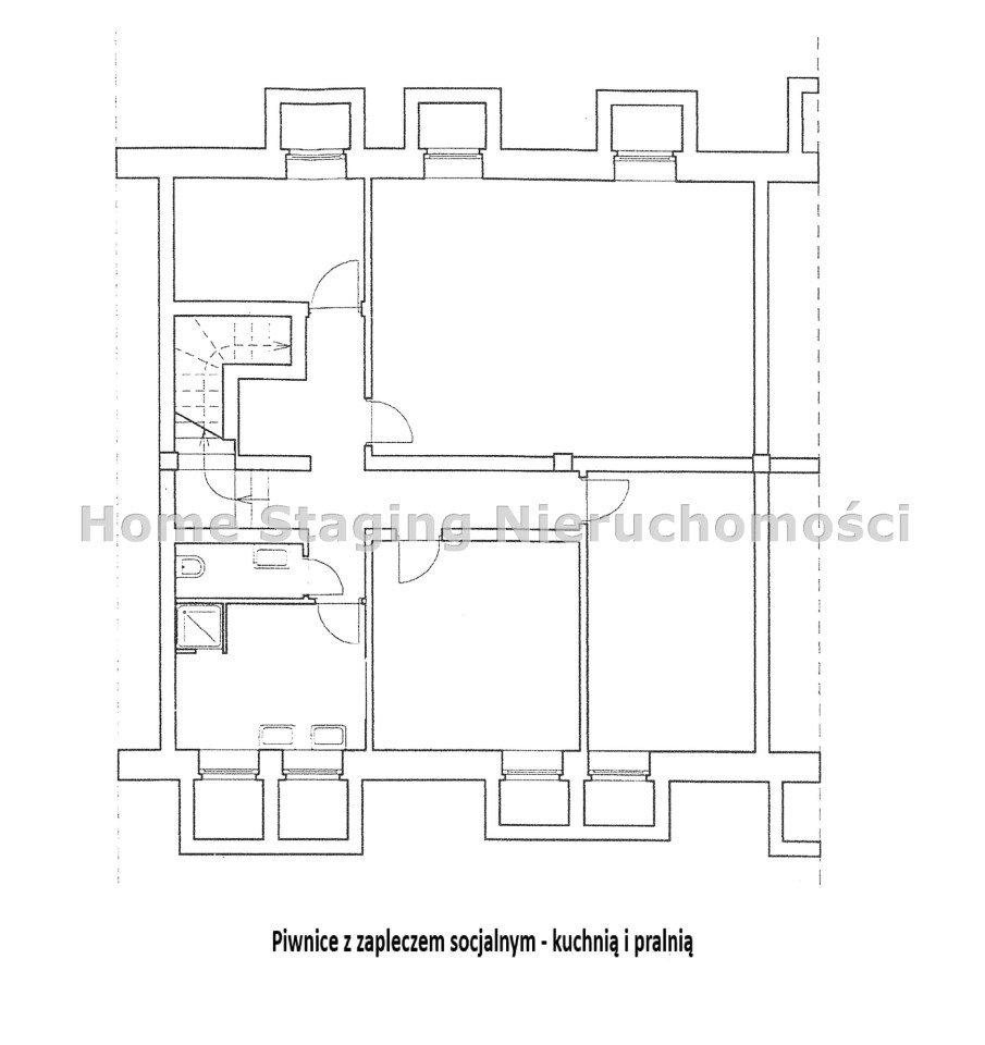 Piwnica: cztery pomieszczenia magazynowe, zaplecze socjalne z kuchnią i pralnią oraz wc. Łączna powierzchnia piwnic 81,30 zł.