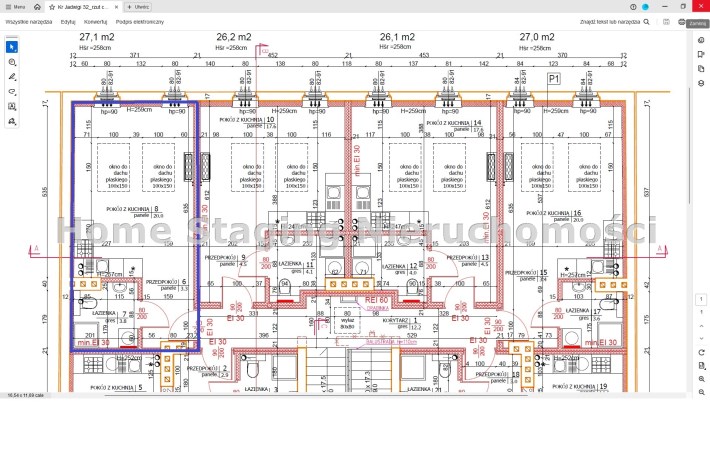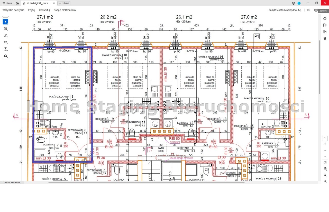 Mieszkanie o jednostronnej, zachodniej ekspozycji okien. Powierzchnia użytkowa wg. dokumentacji projektowej to 27,10 m2.