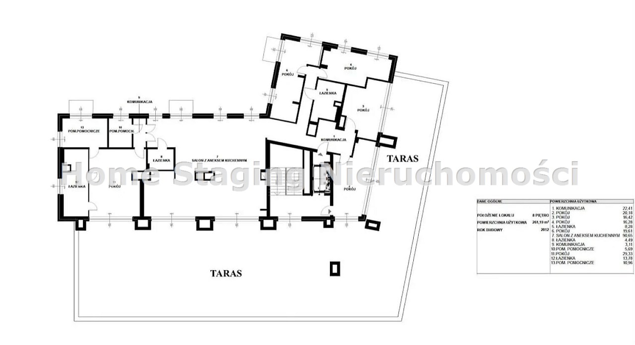Powierzchnia mieszkalna 261 m2, dodatkowo taras 319 m2, 3 balkony o pow. 2,73 m2 każdy, 3 miejsca postojowe plus 2 pomieszczenia gospodarcze.