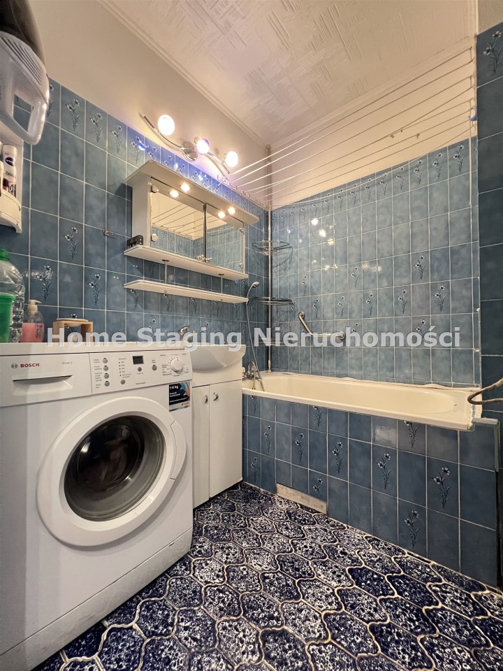 -łazienka wyposażona w wc, umywalkę, wannę oraz pralkę.