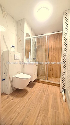 łazienka po remoncie, wyposażona w kabinę prysznicową