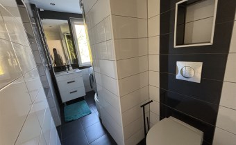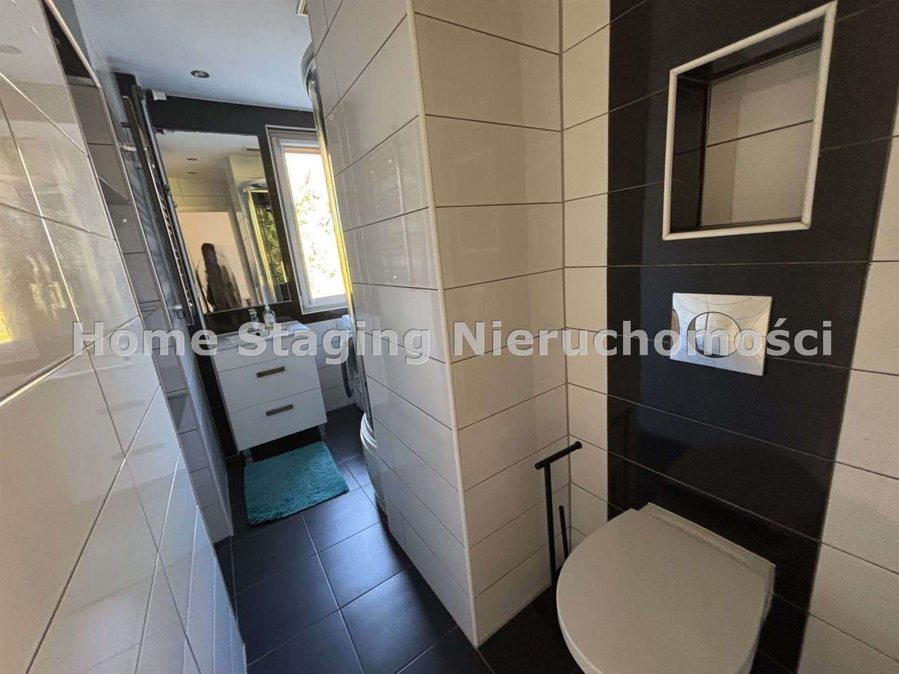 Wyposażenie łazienki kabina prysznicowa, lustro, pralka, umywalka, WC