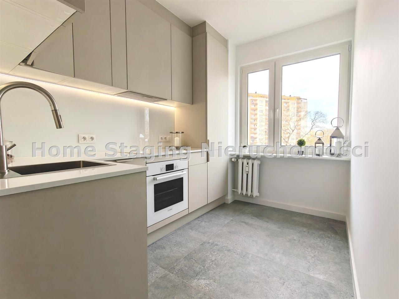 Osobna kuchnia z oknem – wykonana na wymiar przez stolarza, w pełni wyposażona w nowy sprzęt AGD (płyta indukcyjna, piekarnik, lodówka, zmywarka) oraz efektowne podświetlenie LED.