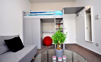 Nieruchomość została wykończona w bardzo wysokim standardzie, każdy pokój wyposażony jest w czujniki dymu, alarm, telewizor, biurko, szafę oraz 2 łóżka.