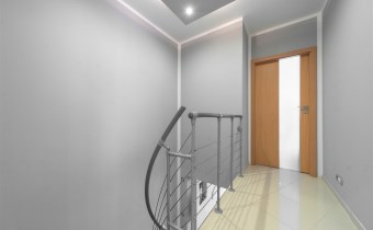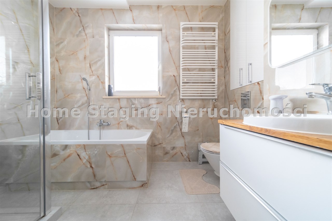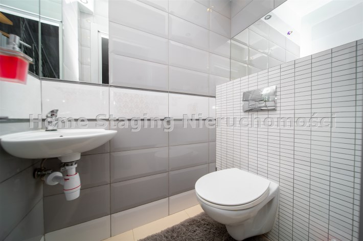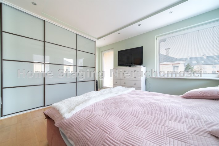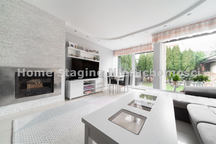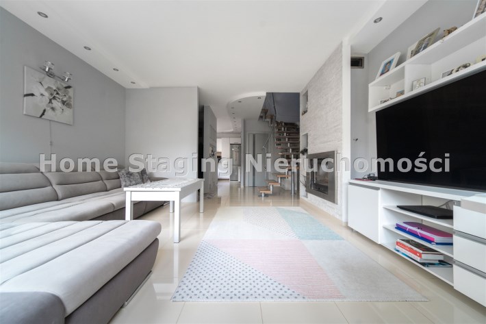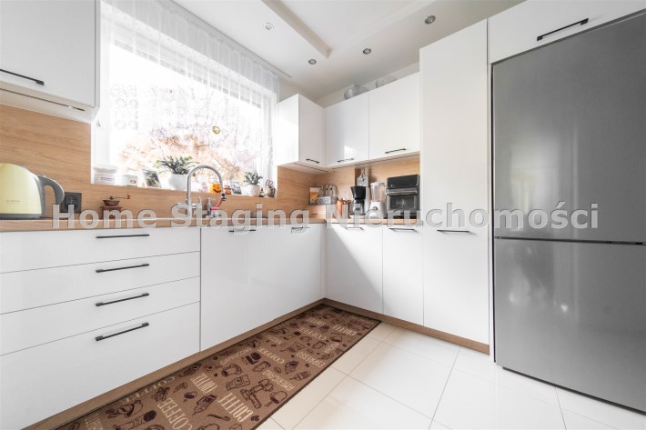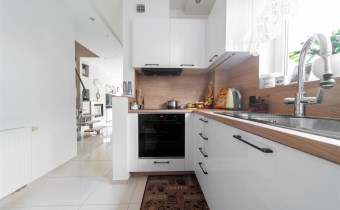 Kuchnia w nowoczesnej zabudowie, ze sprzętem AGD. Salon z kominkiem, jasny z ładnie zaprojektowanym oświetleniem. Na tym poziomie znajduje się również toaleta z umywalką. Z poziomu 0 schodami  wchodzimy na 1 piętro o powierzchni 37 metrów. Znajdują się tam dwie duże sypialnie, każda z balkonem oraz duża łazienka/pokój kąpielowy z prysznicem i wanną.