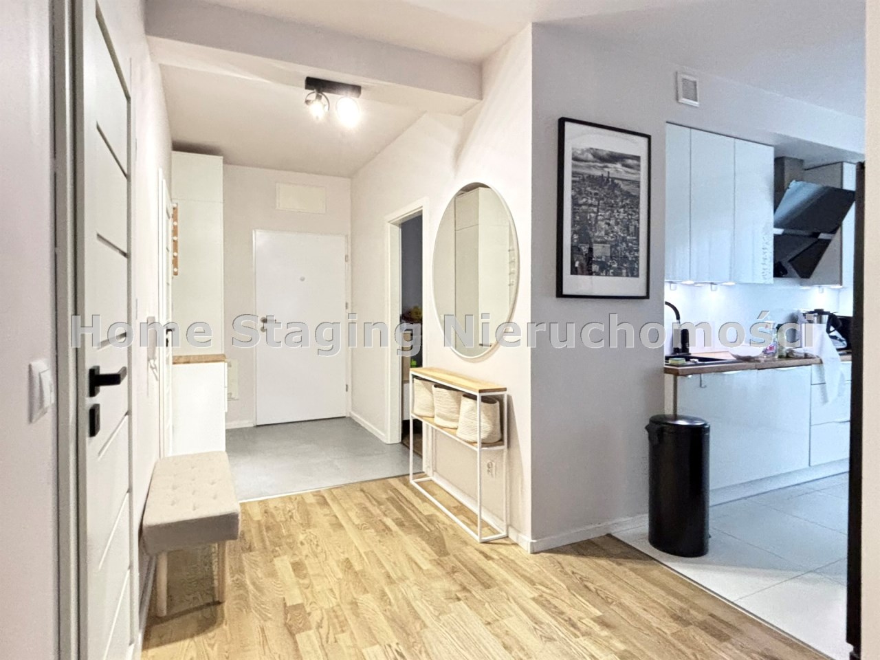 Korytarz wyposażony w wysoką szafę oraz szafkę na buty. Znalazło się tu także wygodne siedzisko oraz konsola z dekoracyjnym lustrem.