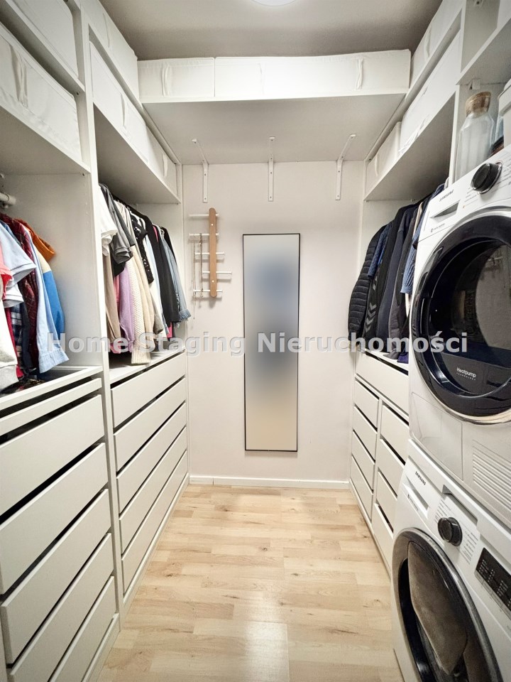 Garderoba z pralką i automatyczną suszarką oraz świetnie zaaranżowaną przestrzenią.