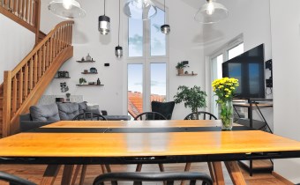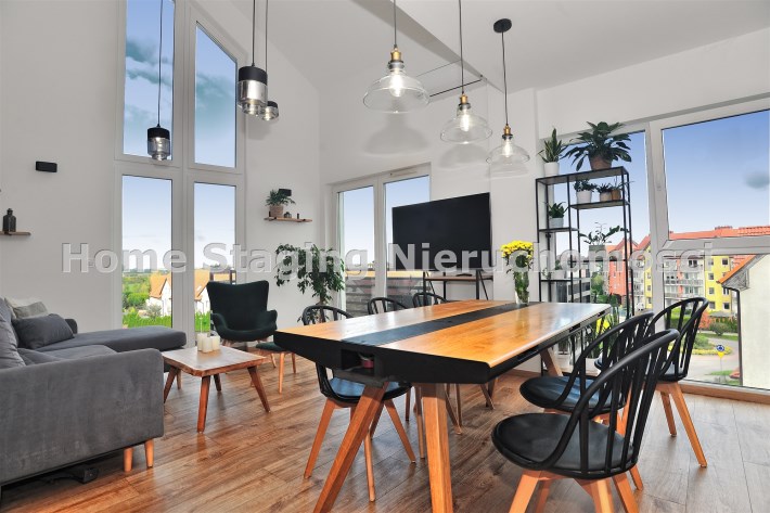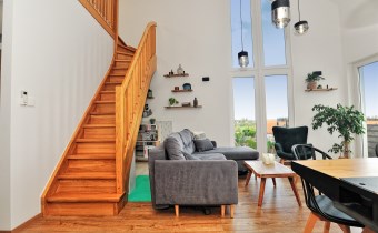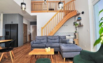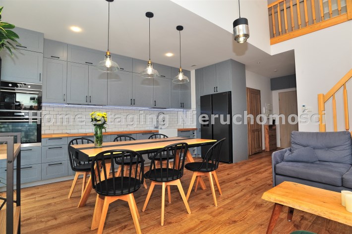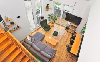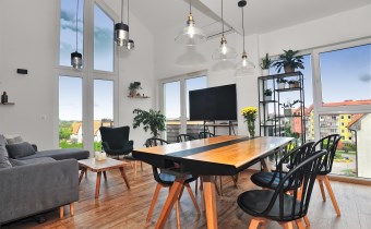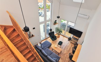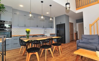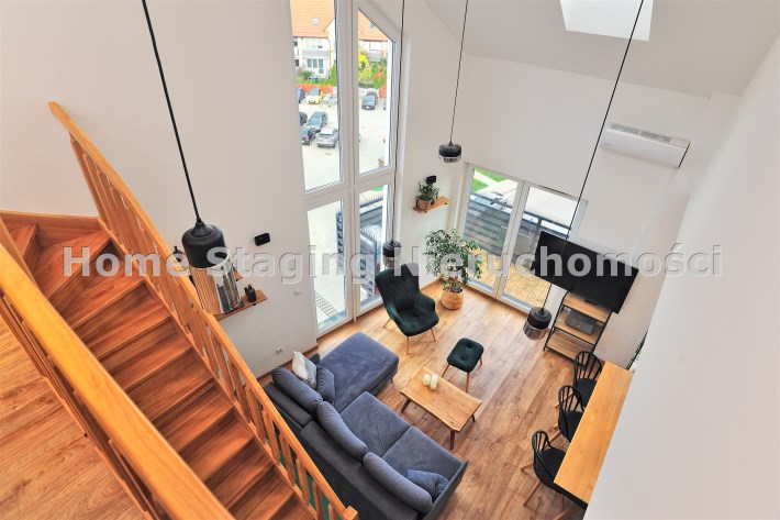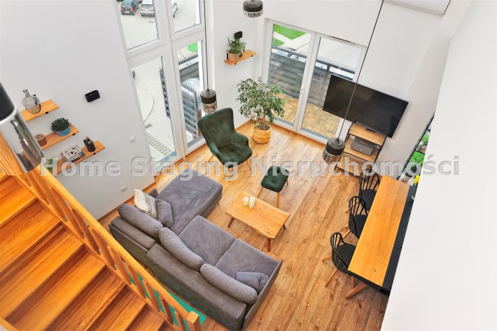 Nietuzinkowe wnętrze z otwartą przestrzenią nad salonem (w najwyższym miejscu 5,5m), wykończone w wysokim standardzie.