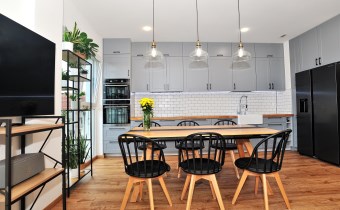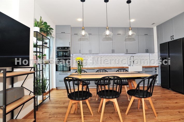 Na pierwszym poziomie znajduje się przestronny salon z aneksem kuchennym (ok 31m2), kuchnia zrobiona na zamówienie z lakierowanymi frontami wyposażona w sprzęt marki Electrolux (zmywarka, piekarnik parowy, kuchenka mikrofalowa, płyta z automatycznym okapem) i lodówkę side by side Samsung.