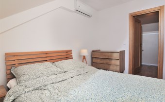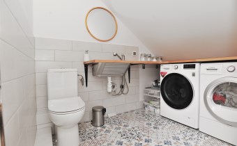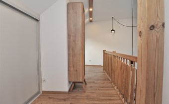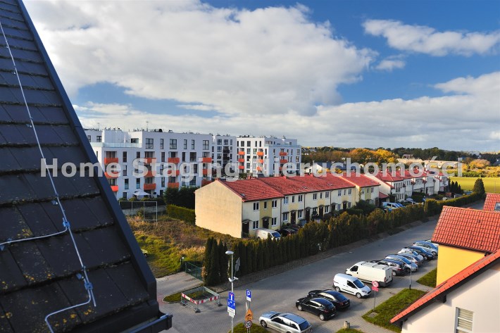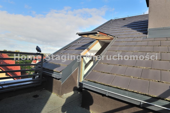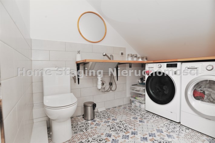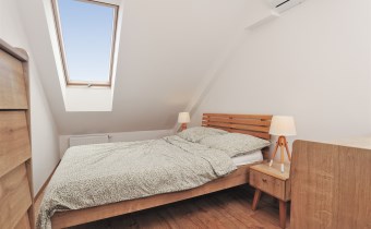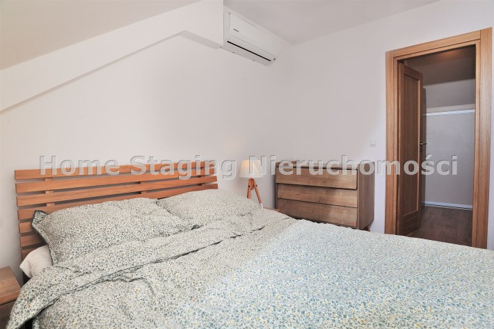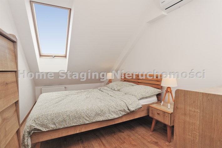 Na górę o powierzchni 20,44 m2 (36,68 m2 powierzchni całkowitej) składa się umeblowana sypialnia, pralnia wyposażona w pralkę i suszarkę, dwie szafy w zabudowie (jedna duża z dodatkową przestrzenią do przechowywania z tyłu), oraz pozostała przestrzeń do zagospodarowania np. na domowe biuro z której jest wyjście na taras o powierzchni 9,77m2.