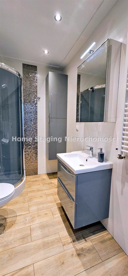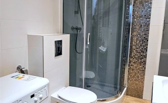 Wyposażenie łazienki lustro, pralka, prysznic, WC