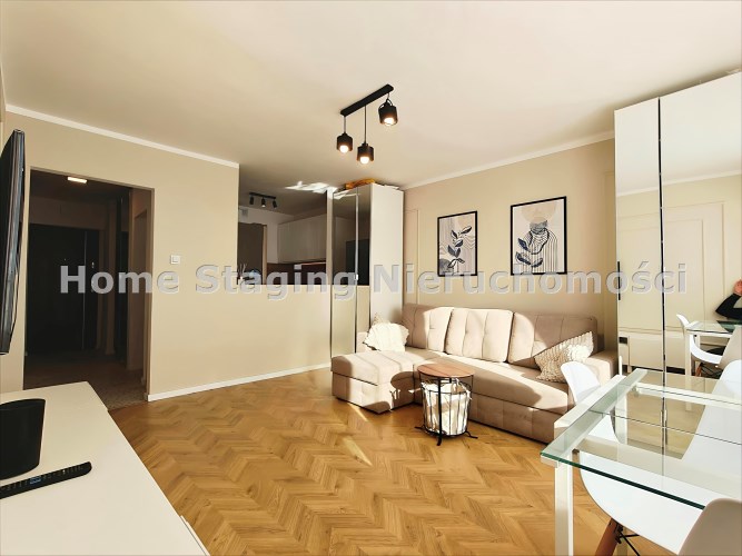 Przemyślany układ pomieszczeń obejmuje oddzielną kuchnię oraz komfortową przestrzeń dzienną, co czyni mieszkanie idealnym wyborem dla jednej osoby lub pary.
