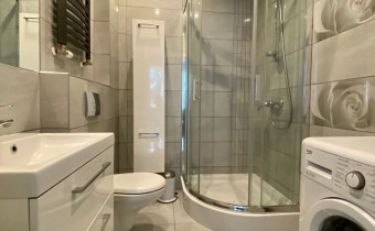 - łazienka z toaletą wyposażona w kabinę prysznicową (pralka na wyposażeniu).