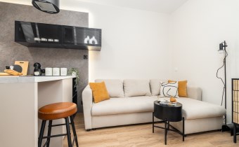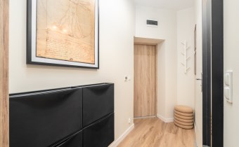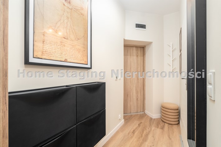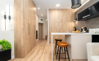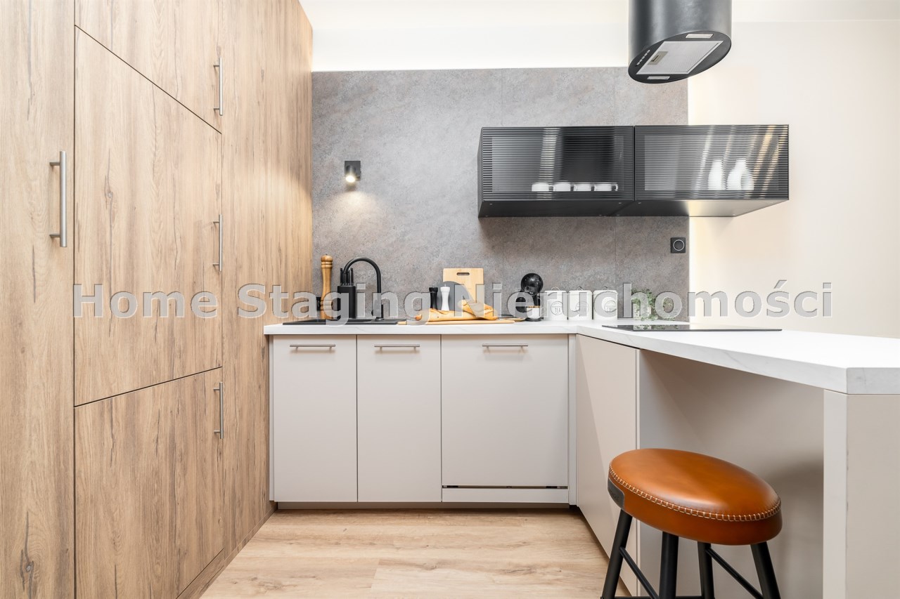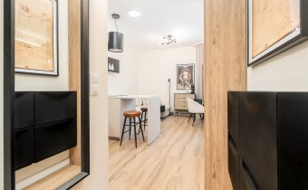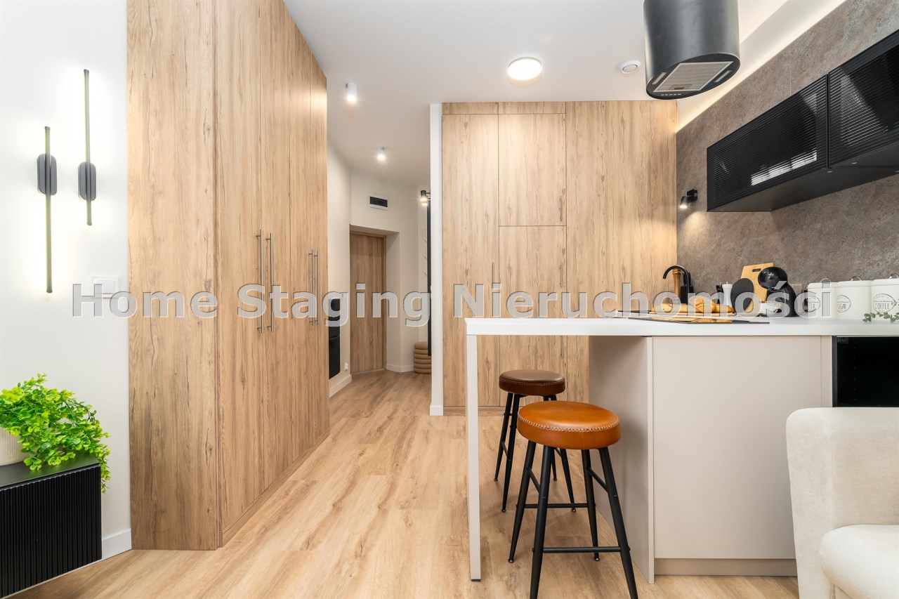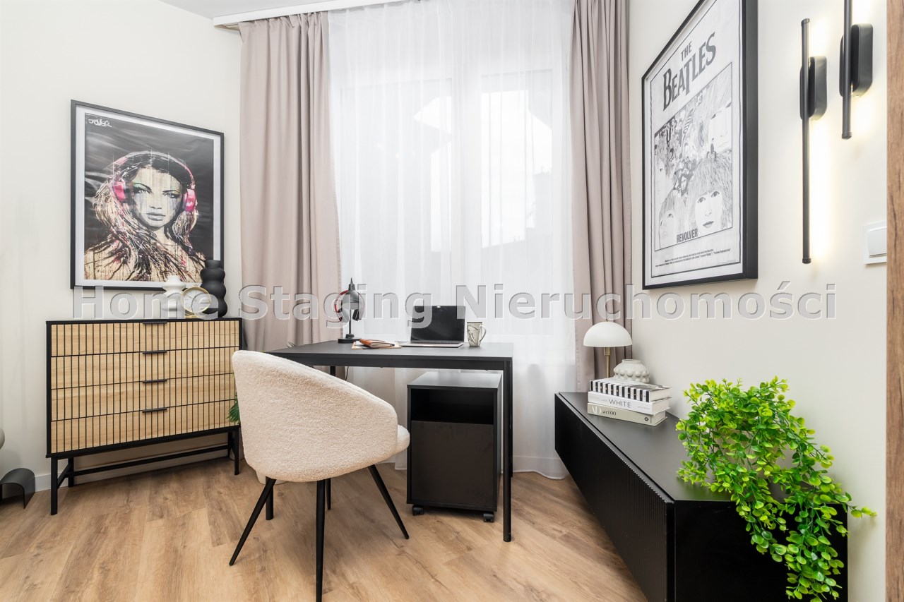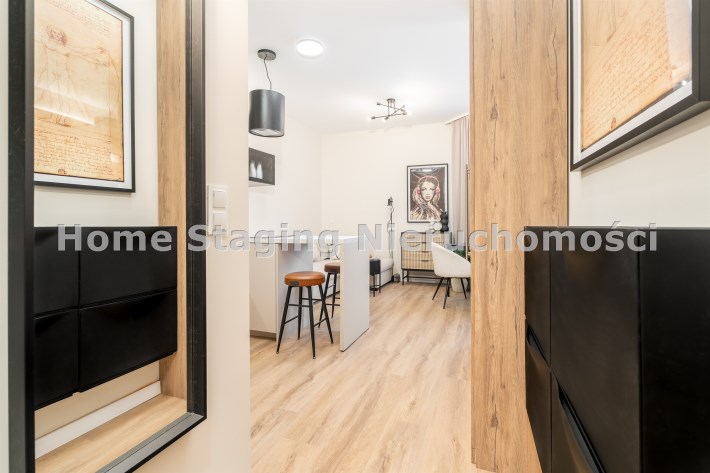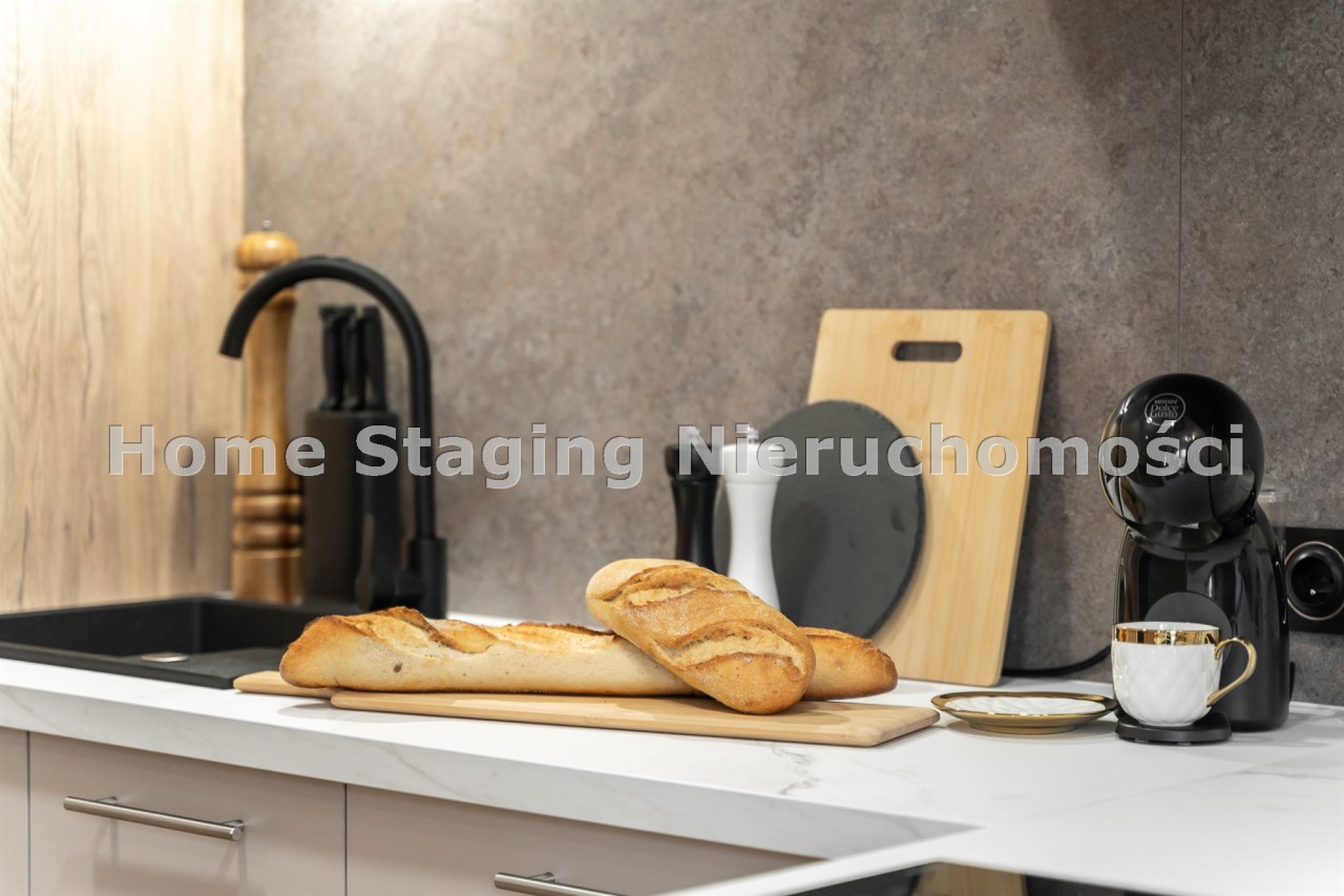 Mieszkanie po remoncie kapitalnym, o południowej ekspozycji okien. Pokój dzienny z aneksem kuchennym, łazienka i korytarz. W pokoju i korytarzu na podłodze panele, ściany wygładzone, malowane. W pokoju wypoczynek, stolik kawowy, biurko, krzesło, komoda, stolik RTV, duża szafa ubraniowa i szafka na buty. Łazienka w glazurze i terakocie, kabina prysznicowa, muszla podwieszana typu geberit, umywalka, meble łazienkowe, lustro, pralka. Kuchnia kompletnie umeblowana i wyposażona: barek, dwa stołki barowe, duża lodówka z zamrażalnikiem, lodówka, płyta elektryczna, okap, zmywarka, mikrofala.