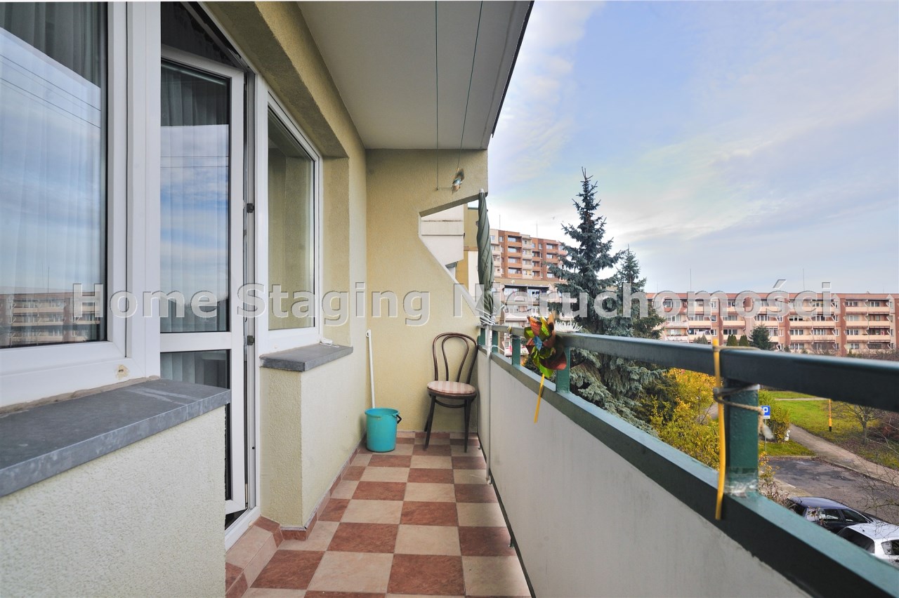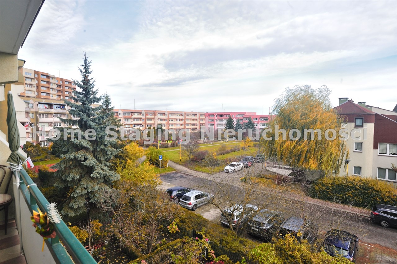 Pokój dzienny z balkonem, w holu szafa, sypialnia od strony południowej.