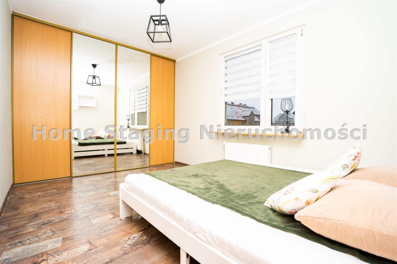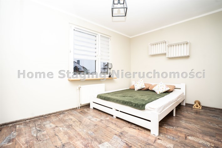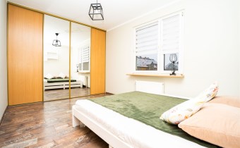 sypialnia wyposażona w łóżko o wymiarach 160 cm oraz pojemną szafę w zabudowie typu Komandor,