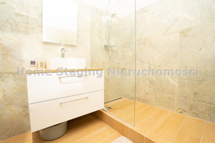 łazienka z kabiną prysznicową, na wyposażeniu pralka.