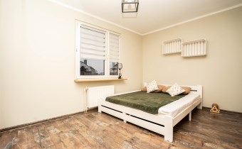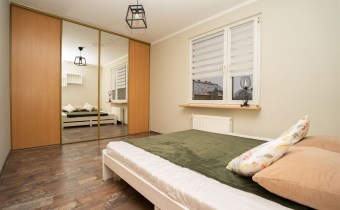 sypialnia wyposażona w łóżko o wymiarach 160 cm oraz pojemną szafę w zabudowie typu Komandor,