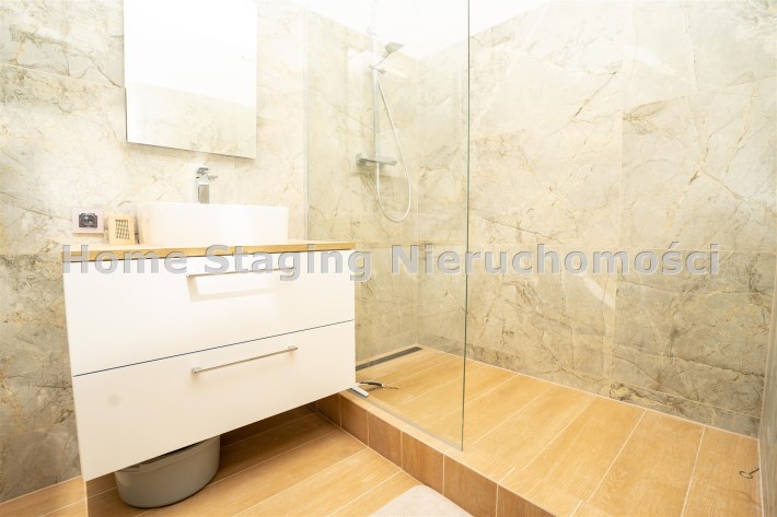 łazienka z kabiną prysznicową, na wyposażeniu pralka.