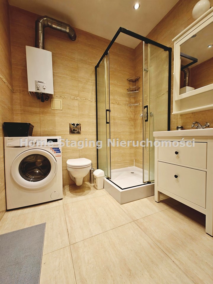 Wyposażenie łazienki WC, umywalka na szafce, prysznic, pralka, lustro