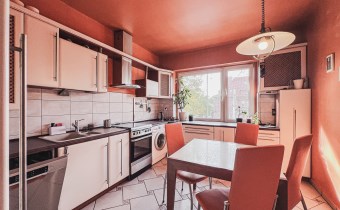 • w kuchni lodówka, kuchenka gazowa, zmywarka 60 cm, pralka, dużo miejsca do przechowywania, a także stół z krzesłami