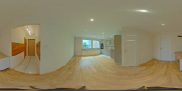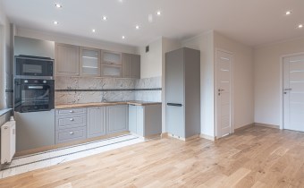 Kuchnia w formie aneksu umeblowana i wyposażona w sprzęt AGD: płyta indukcyjna, piekarnik elektryczny, zabudowana kuchenka mikrofalowa, zmywarka oraz nowa, zabudowana lodówka z zamrażalką. Podłoga w części aneksu i fartuch roboczy wykonane z marmuru. Nad aneksem podwieszany sufit, docieplony wełną akustyczną.