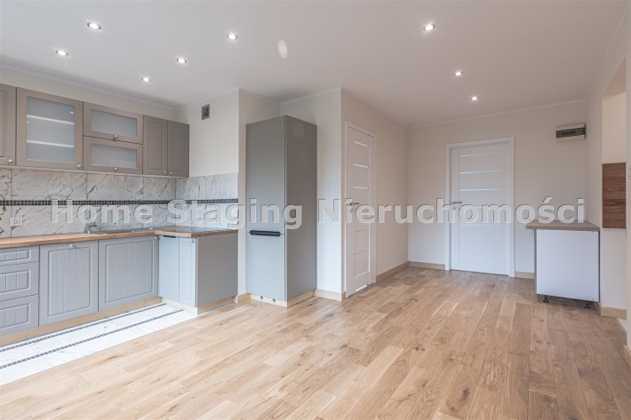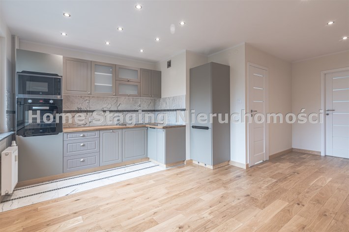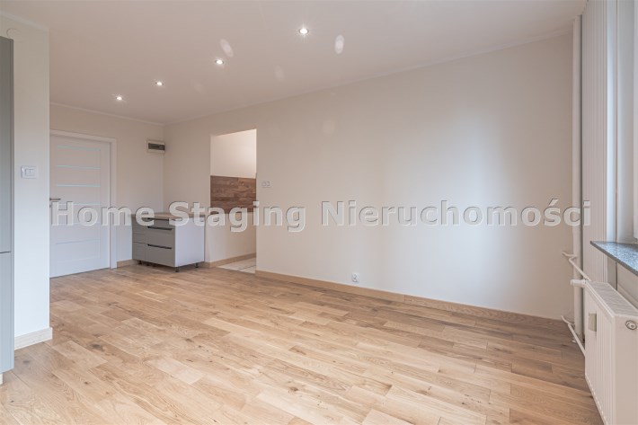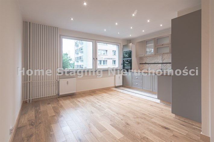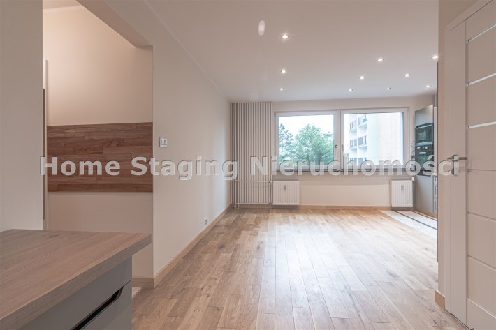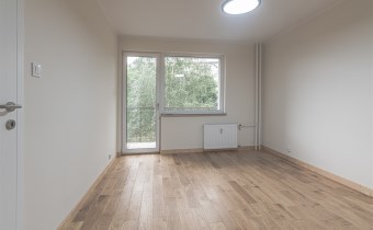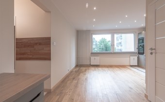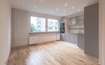Mieszkanie zaaranżowane w nowoczesnym stylu - salon otwarty na przedpokój, połączony z aneksem kuchennym, duża sypialnia z balkonem i mały pokój. Łazienka połączona z wc. Lokal po remoncie generalnym.