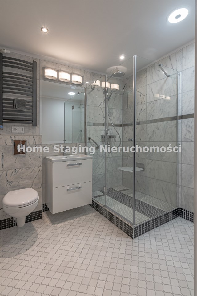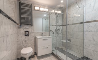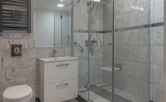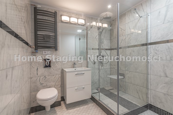 Łazienka razem z wc - bardzo duża kabina prysznicowa z odpływem liniowym i krzesełkiem, wyposażona w radio bluetooth - sterowane smartfonem. Podłogi i ściany wyłożone marmurem.