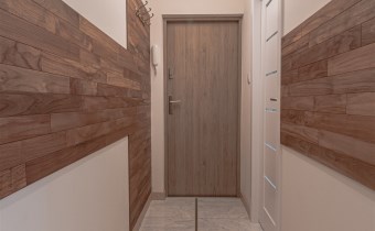 Przedpokój - podłoga marmurowa, ściany częściowo wyłożone egzotycznym drewnem teak.