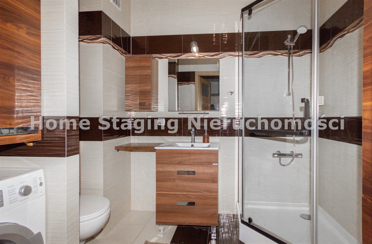 - łazienka z kabiną prysznicową i pralką,