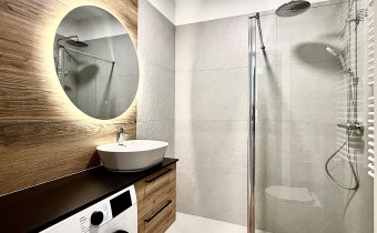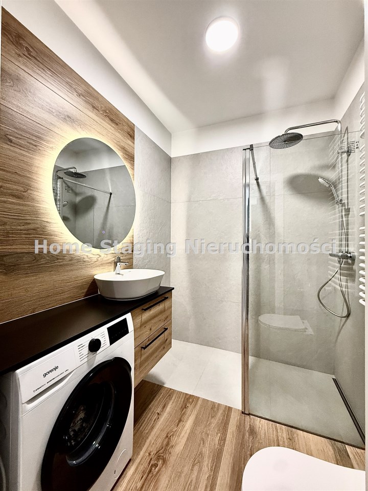 Wyposażenie łazienki WC, pralka, lustro, kabina prysznicowa